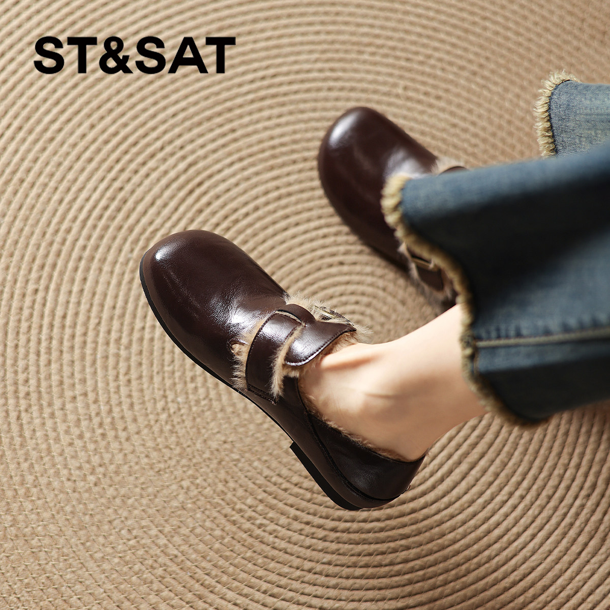 星期六舒适加绒豆豆鞋真皮勃肯鞋女鞋2025冬季新款保暖毛毛鞋单鞋
