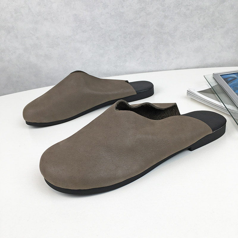 淘宝绿耳复古文艺范拖鞋女鞋外穿新款平底圆头半拖真皮软皮懒人拖鞋
