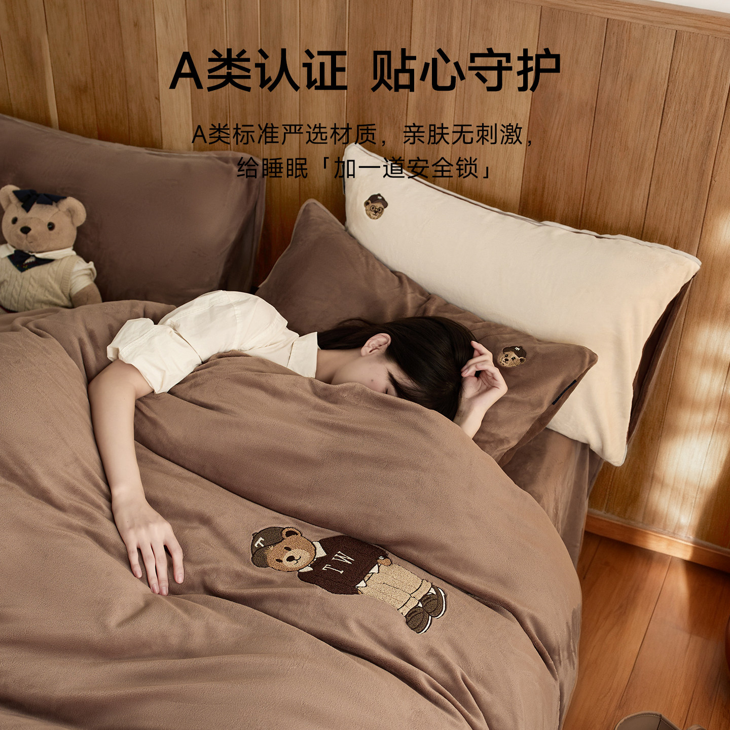 天猫TeenieWeenie小熊A类棕色毛巾绣床上四件套纯色加厚珊瑚绒被套罩