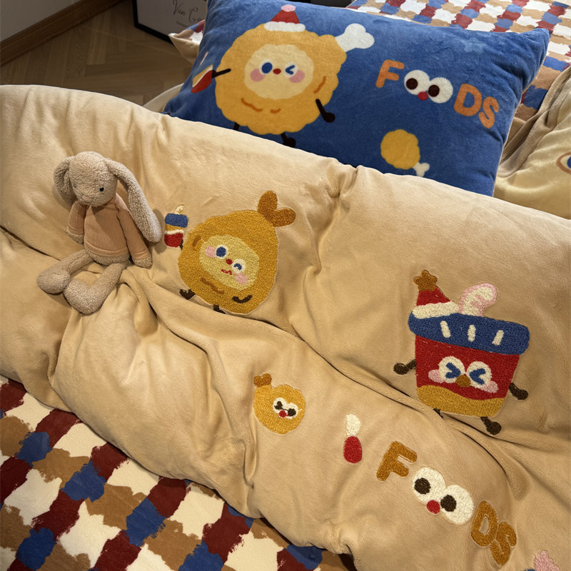 淘宝ins冬季加厚牛奶绒毛巾绣卡通美式炸鸡床上四件套珊瑚绒1.5m1.8米