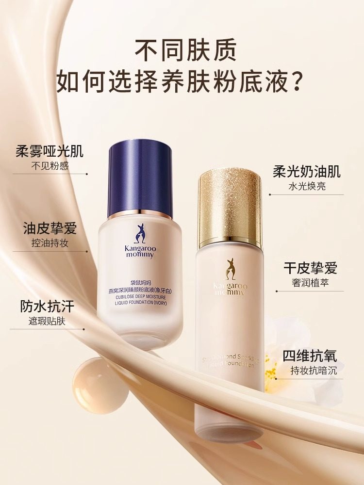 袋鼠妈妈粉底液专为孕期女性设计,成分温和安全,不含酒精、香精、重金属及孕妇慎用成分,通过严格皮肤测试,孕期、哺乳期均可安心使用。其质地轻薄水润,延展性好,能自然贴合肌肤,有效遮盖痘印、斑点与暗沉,打造清透无瑕妆效。同时具备持久控油与防水防汗配方,长时间持妆不脱妆,避免频繁补妆困扰。添加多种植物精粹,如积雪草、维生素E等,在美妆的同时滋养肌肤,减少孕期肌肤敏感问题。无论是日常通勤还是重要场合,袋鼠妈妈粉底液都能让您在特殊时期依然光彩自信,安全又美丽。