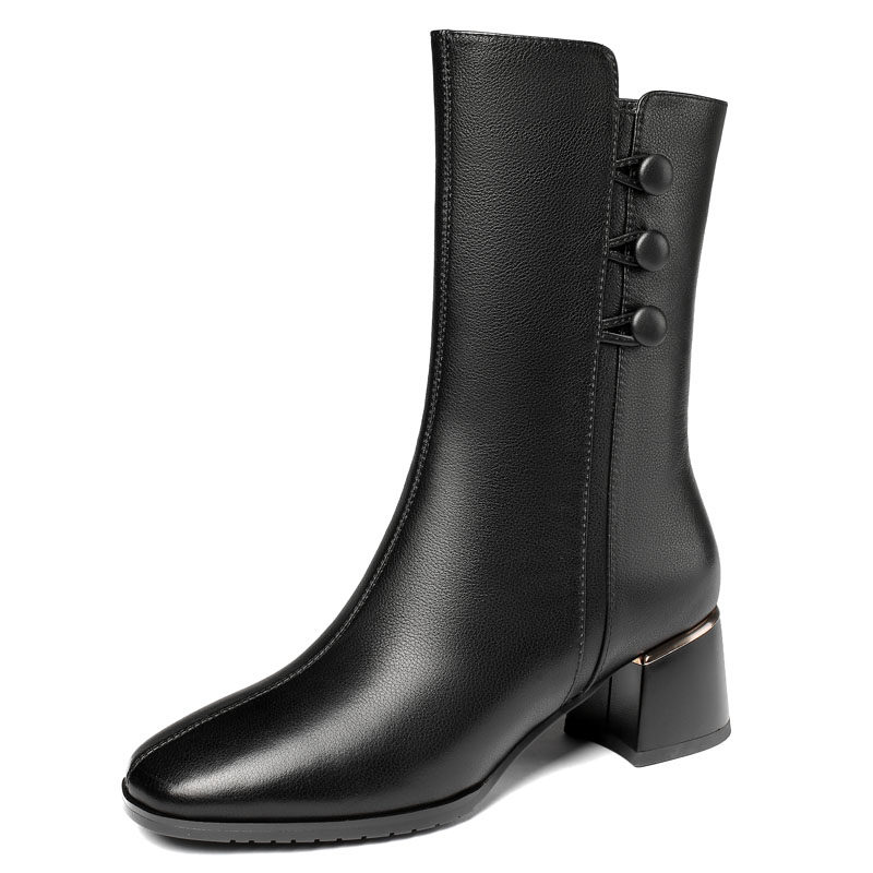 这款全牛皮中筒靴是2023秋冬新款,精选优质真皮材质,质感细腻、耐穿透气。采用圆头设计,舒适不挤脚,搭配粗跟造型,稳固显高又兼顾日常行走的舒适性。靴筒高度适中,完美修饰腿型,内里加绒处理,保暖性佳,适合秋冬季节穿着。简约百搭的款式设计,轻松驾驭牛仔裤、半身裙或大衣等多种穿搭风格。提供大码选择,满足不同脚型需求。无论是通勤、逛街还是休闲出行,这款真皮中筒靴都能为你增添时尚与温暖,是秋冬衣橱的必备单品。