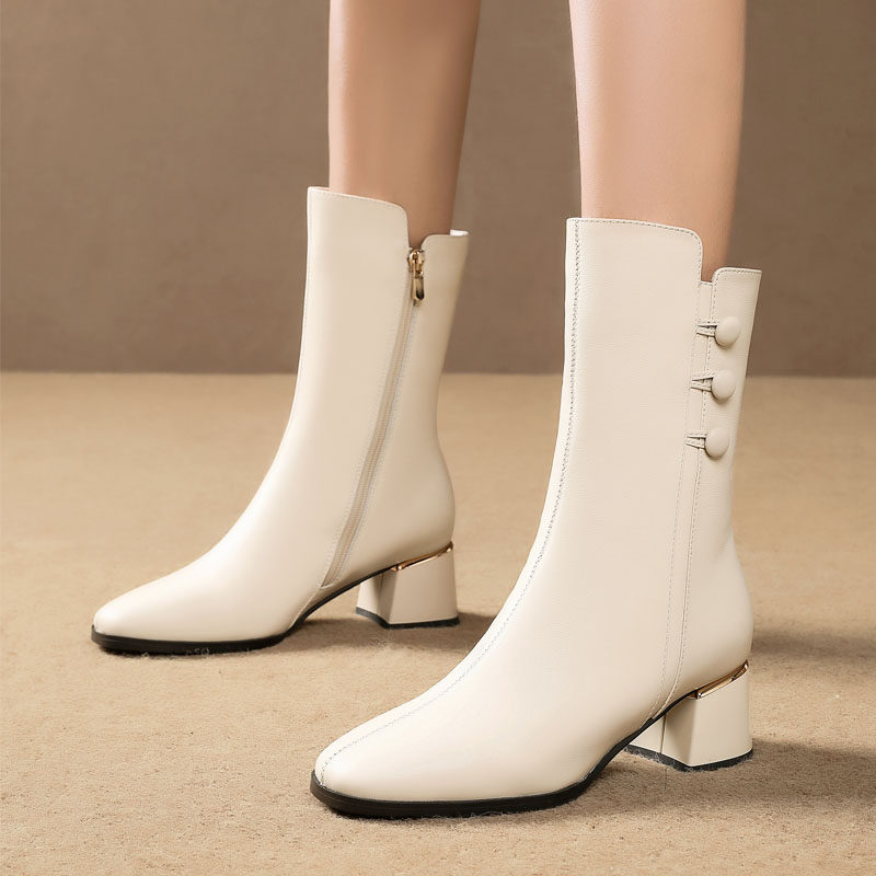 淘宝全牛皮中筒靴女粗跟百搭秋冬新款加绒真皮靴子女圆头中跟大码女靴