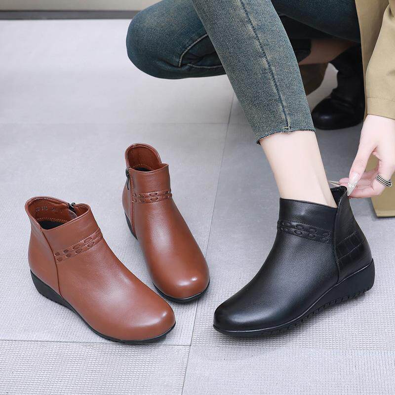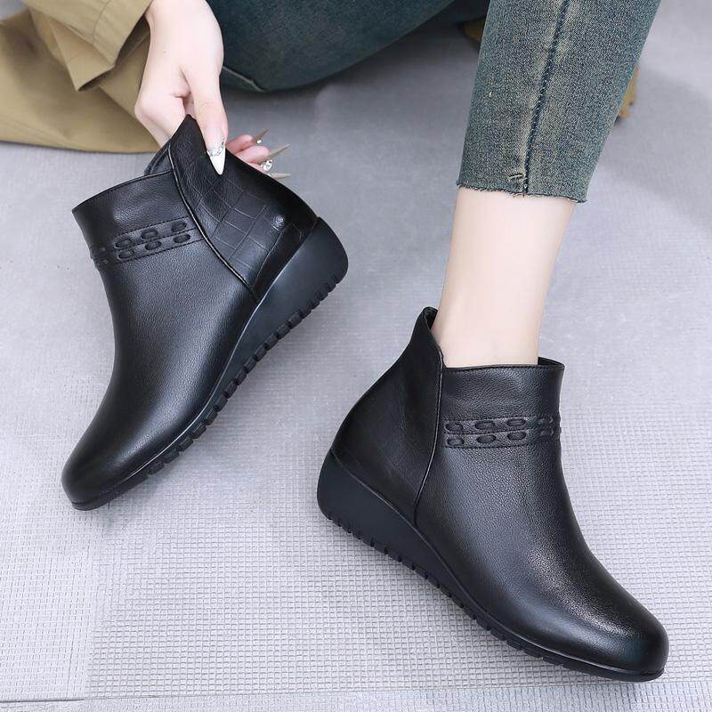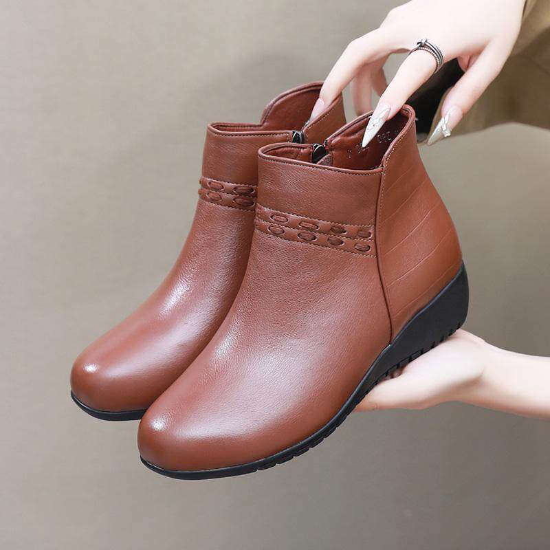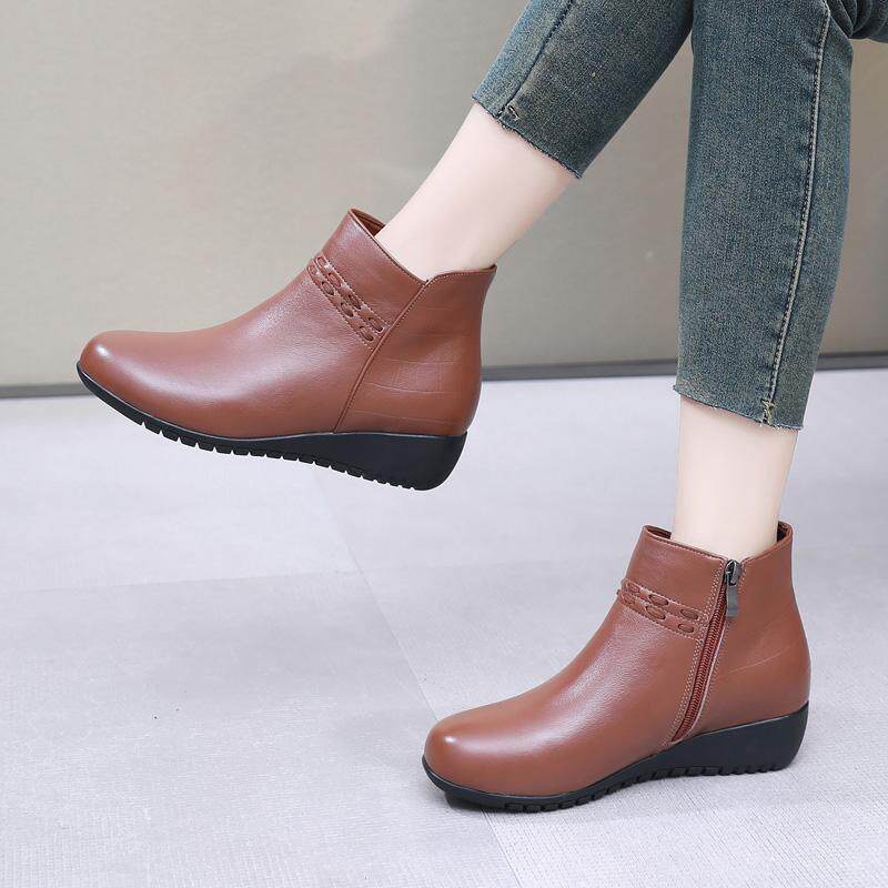 天猫真皮短靴女低跟妈妈鞋软底单靴舒适平底靴子冬季女鞋大码加绒棉鞋
