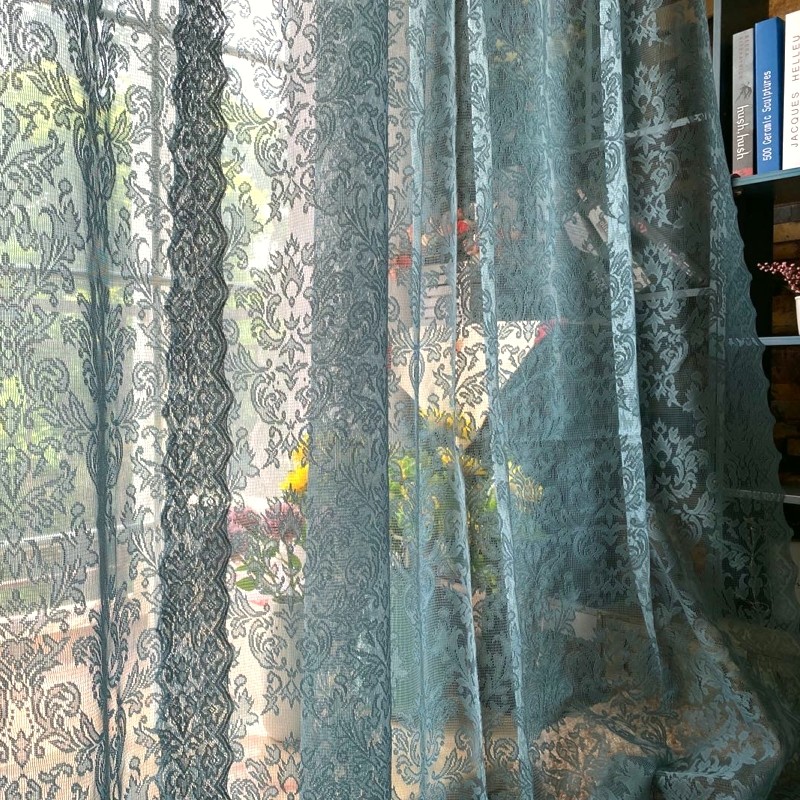 淘绿色蕾丝窗纱免打孔法式纱帘魔术贴装饰飘窗卧室阳台窗帘遮光安装