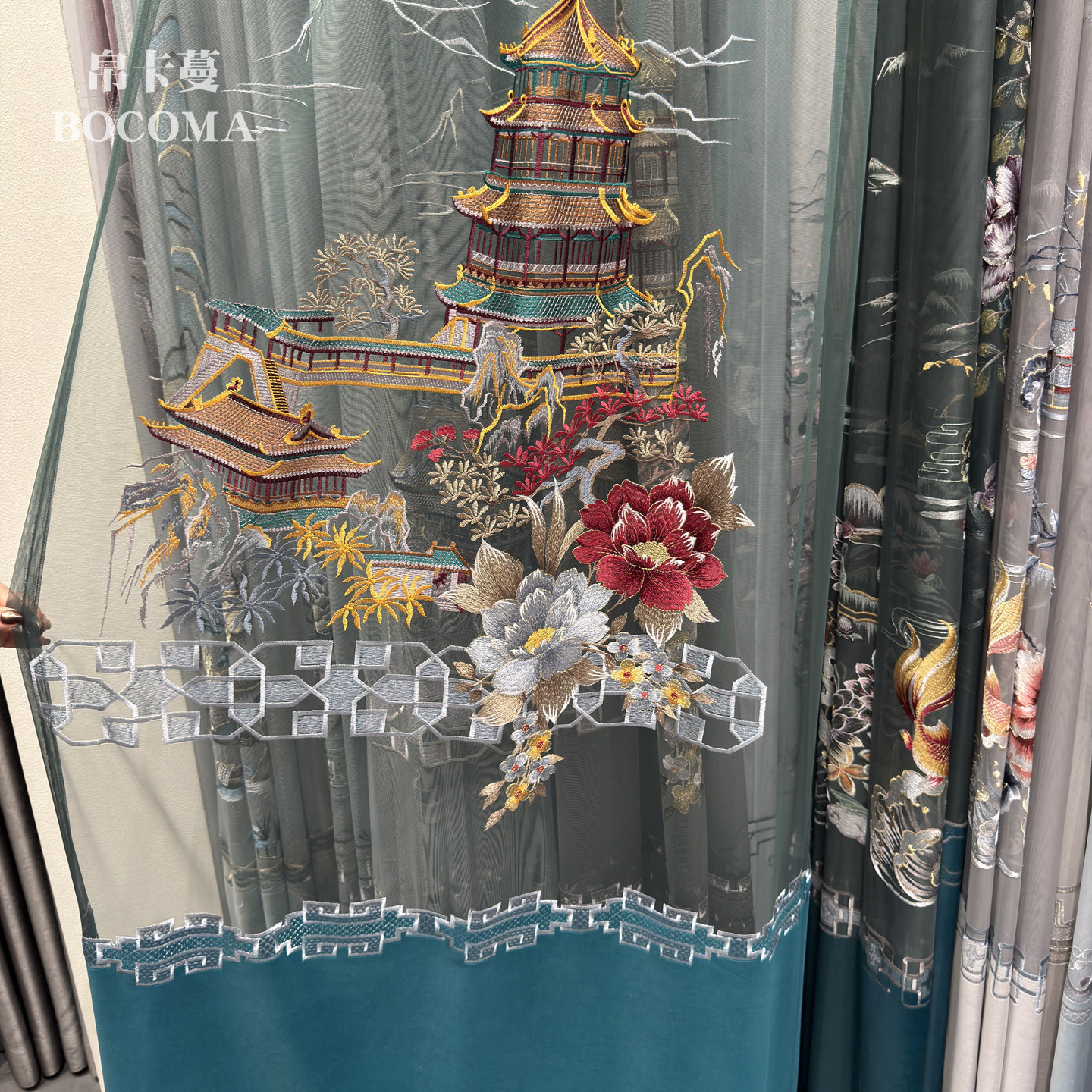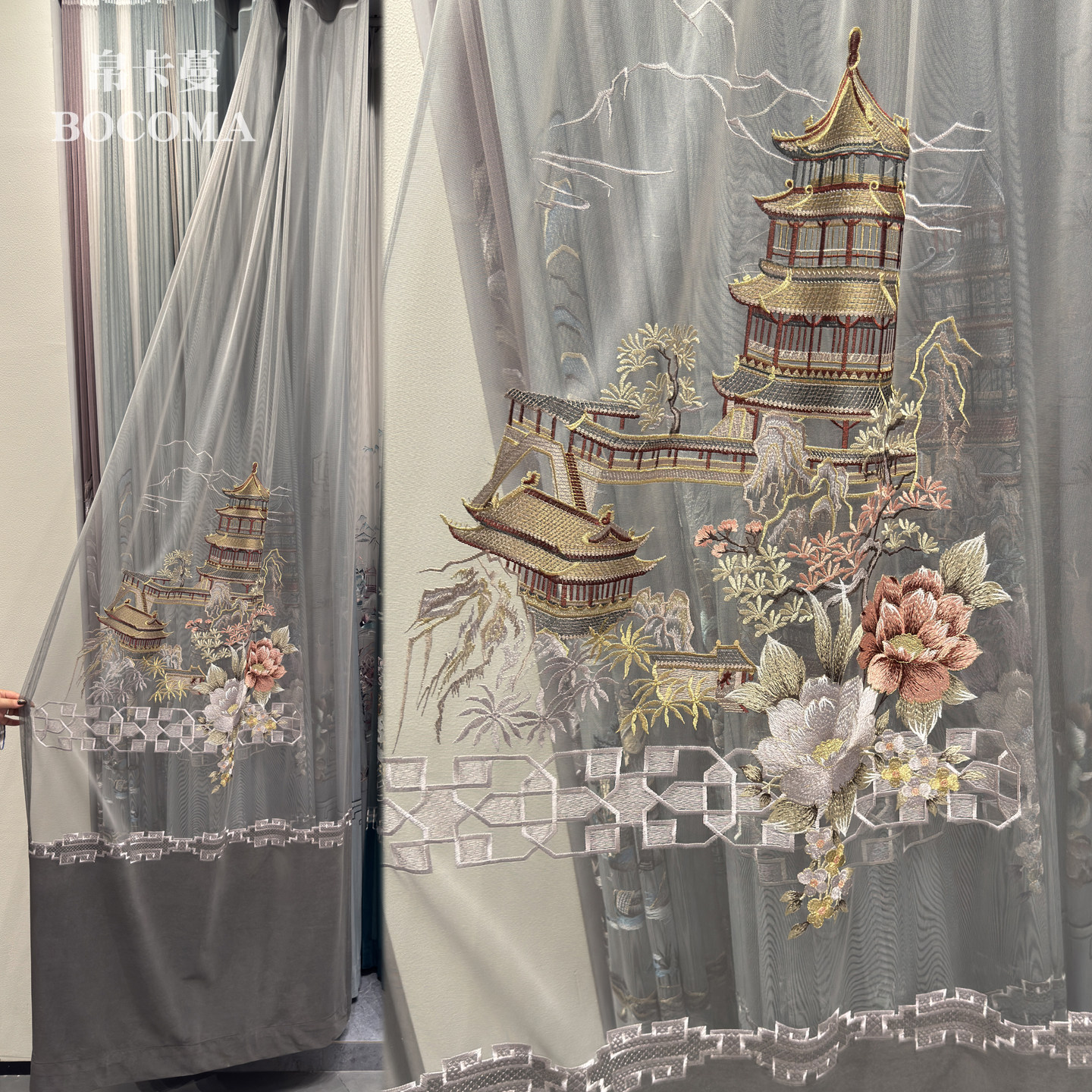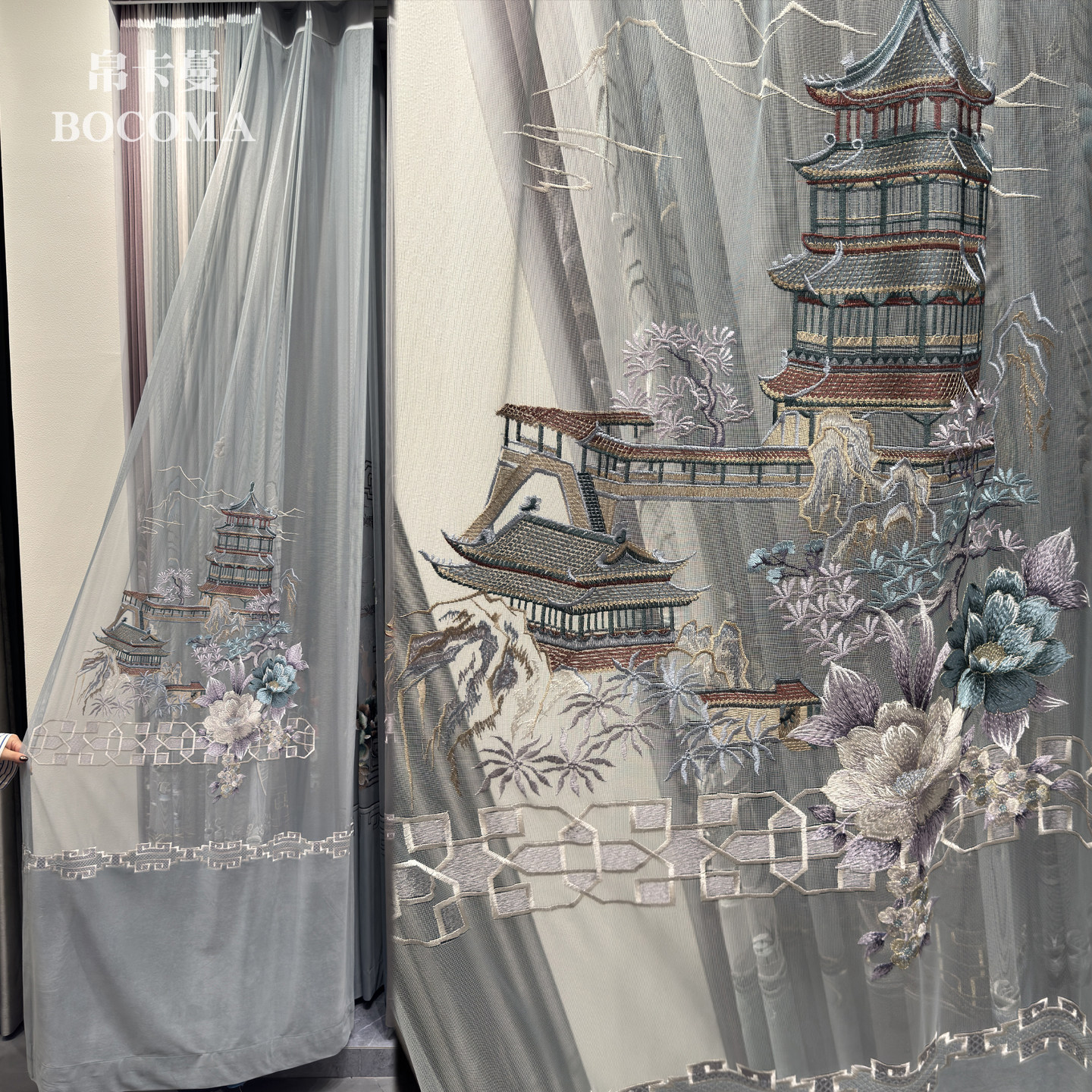 淘宝新中式复古亭台楼阁高档豪华别墅客厅阳台绣花窗帘窗纱帘成品定制