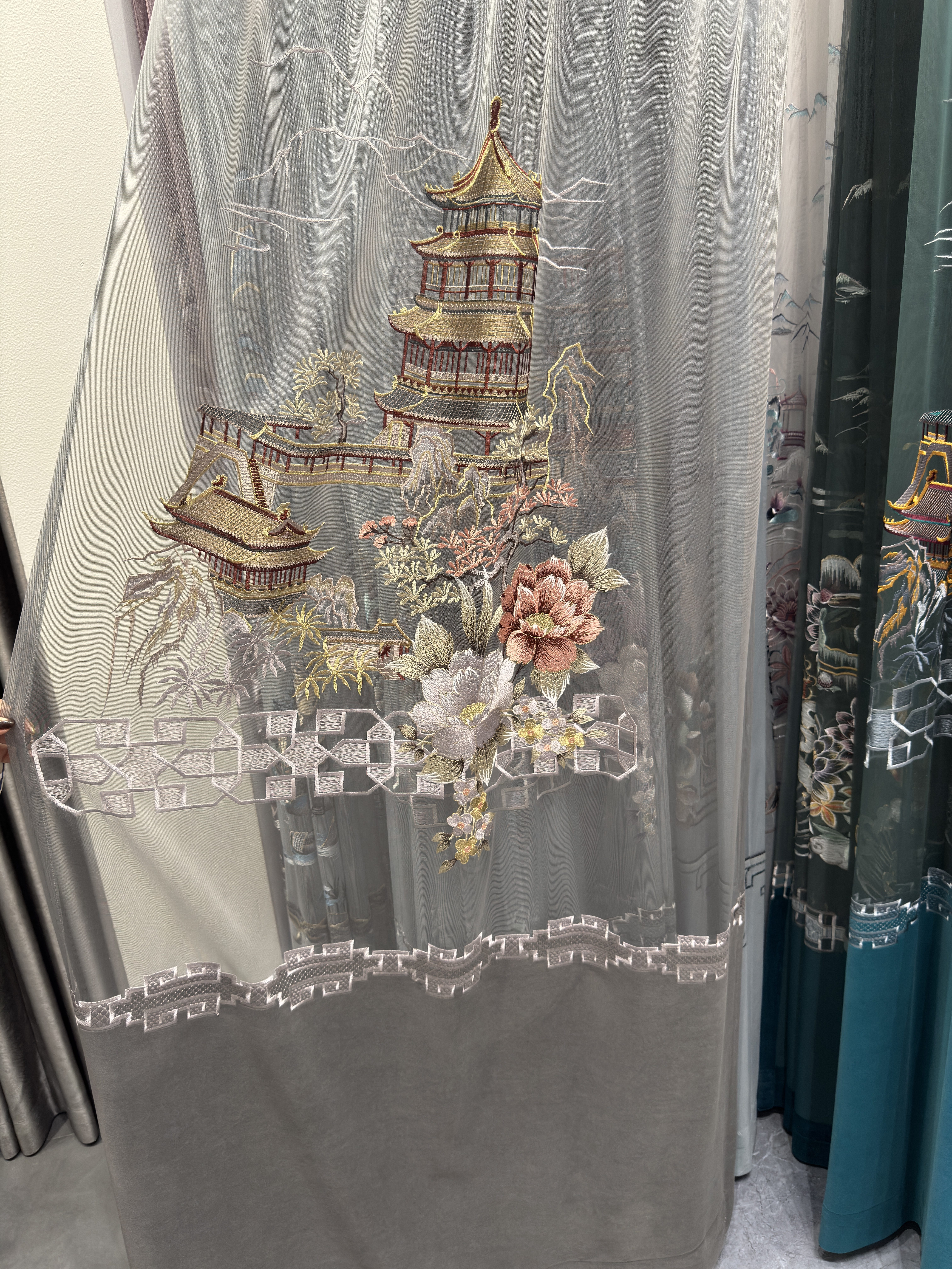 本款新中式复古亭台楼阁高档豪华别墅客厅阳台绣花窗帘窗纱帘,专为追求东方雅韵与现代奢华融合的居室空间定制。采用优质高精密面料,以传统亭台楼阁、花鸟山水为刺绣主题,针法细腻,层次分明,尽显古典美学意境。窗纱轻盈透光,与厚重帘体搭配,营造光影交错的诗意氛围。支持成品定制,尺寸精准,工艺考究,适用于别墅客厅、阳台等大空间,兼具装饰性与实用性。整体设计融合中式元素与现代审美,彰显主人高雅品位,为家居注入宁静致远的文化底蕴,是高端住宅软装的理想之选。