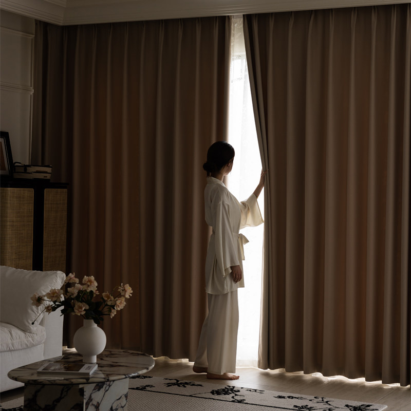 这款奶茶色卧室遮光窗帘,融合法式轻奢美学与现代实用功能,采用高品质定制面料,色调温润柔和,营造温馨静谧的居家氛围。遮光层有效阻隔强光,保障睡眠质量;搭配同系列透光不透人的客厅纱帘,轻盈飘逸,柔化光线的同时保护隐私。窗纱纹理细腻,垂感佳,尽显优雅格调。支持全屋定制尺寸,适配各种窗型,安装便捷。无论是卧室、客厅还是飘窗,都能实现风格统一、功能兼备的整体软装效果,为家居空间增添一抹高级质感与艺术气息,是现代轻奢风装修的理想之选。