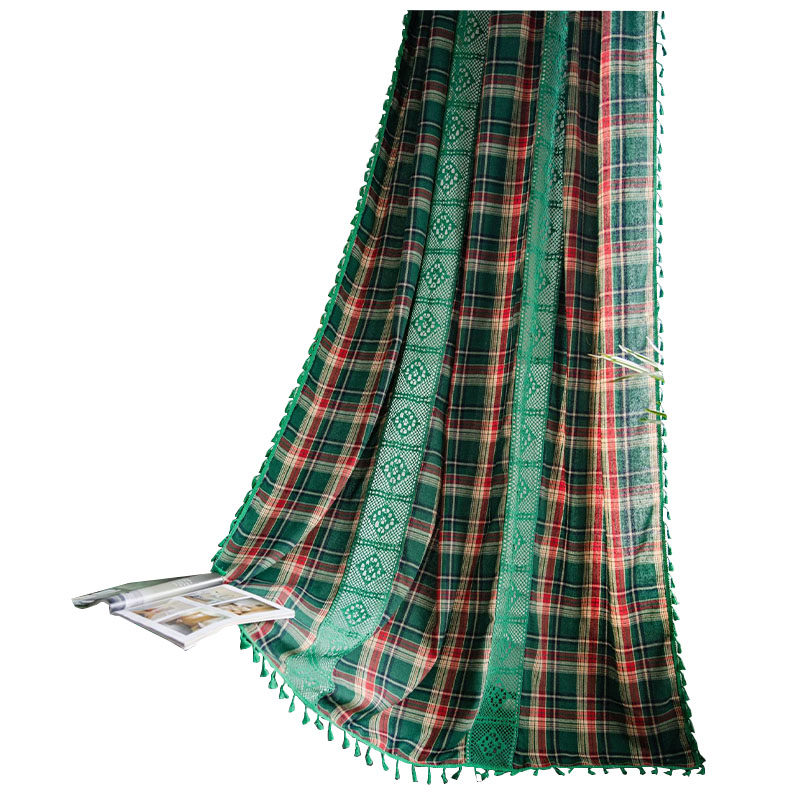淘宝窗纱窗帘美式复古卧室遮阳半遮光轻奢纱幔阳台飘窗帘绿色格子钩拼
