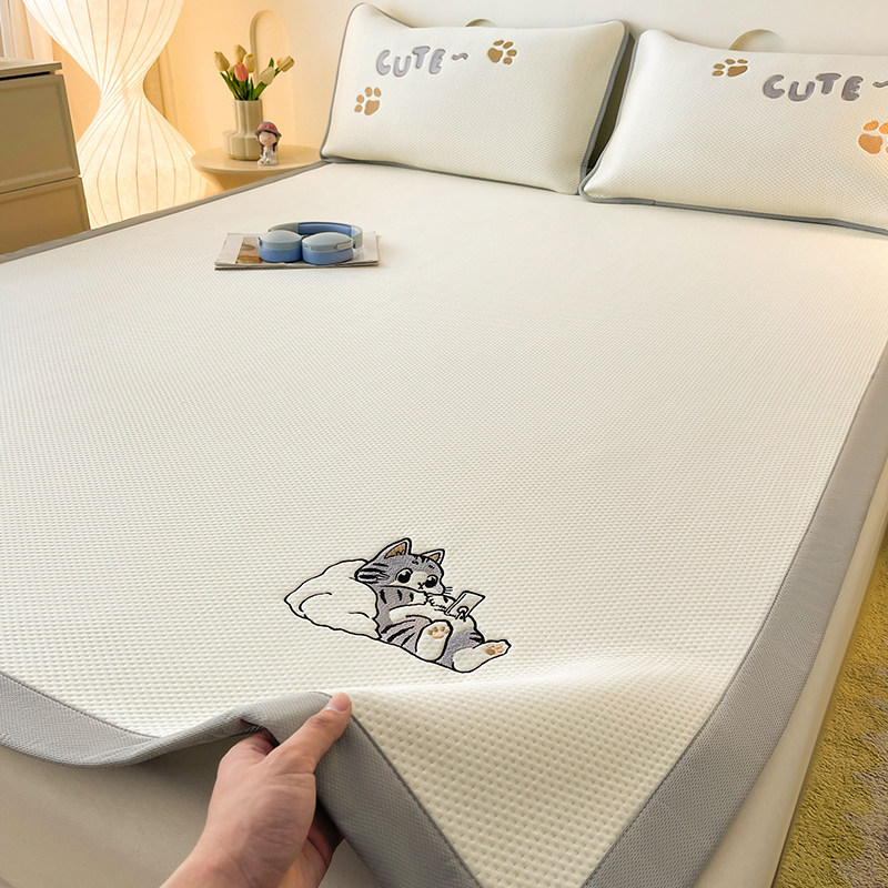 夏季凉感冰丝豆豆凉席三件套,采用优质冰丝面料,触感清凉顺滑,透气排湿,有效缓解夏日闷热。表面立体豆豆颗粒设计,柔软亲肤,按摩舒适,特别适合儿童与婴儿娇嫩肌肤。床笠款设计贴合床垫,不易移位,稳固防滑。可机洗设计,清洁方便,快速晾干,持久保持洁净卫生。搭配空调使用,柔软不冰,体感舒适,避免着凉。三件套包含凉席、枕套和被套(或床单),满足全家夏日清凉需求。环保材质,安全无刺激,是夏季居家、宿舍、婴儿床的理想选择,让每一晚都清爽安睡。