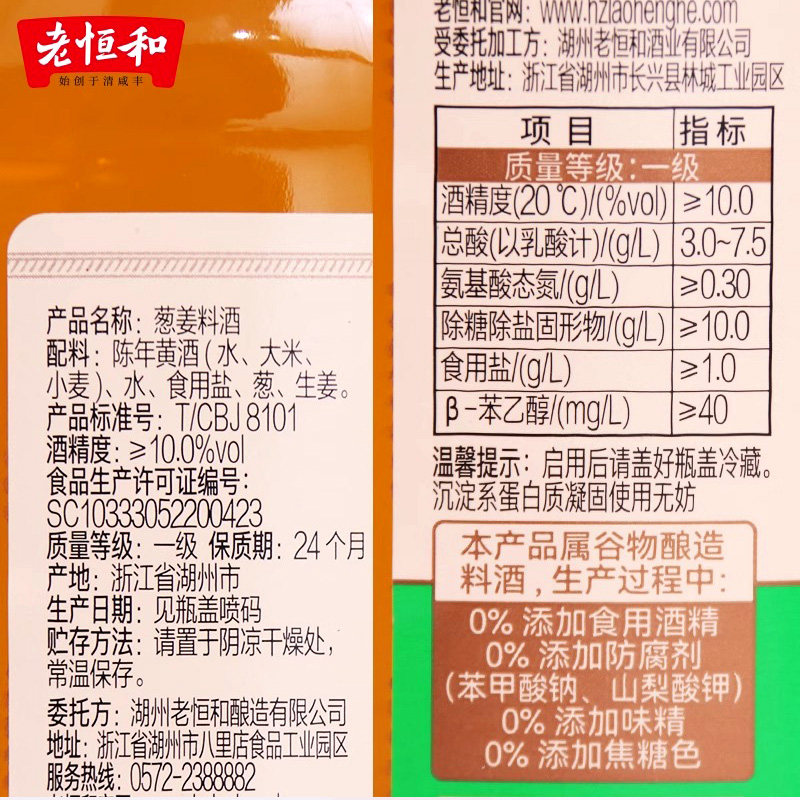 淘宝老恒和葱姜料酒500ml瓶装五年香0添加去腥解膻烧菜腌制黄酒家用
