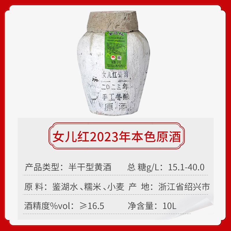 绍兴女儿红黄酒本色原酒花雕酒2023年手工冬酿原浆酒,精选优质糯米、小麦与鉴湖水,秉承古法冬酿工艺,经自然发酵、长期陈藏而成。酒体醇厚甘润,色泽琥珀透亮,香气馥郁,入口绵柔,回味悠长。作为传统花雕酒的代表,其“女儿红”寓意吉祥美满,常用于婚庆、节庆等重要场合。2023年手工原浆酒,未添加焦糖色,保持黄酒本色原味,更显天然纯粹。20斤(10KG)大容量装,适合家庭收藏、宴客或馈赠亲友,是品味江南酒文化、感受千年酿造技艺的佳品。