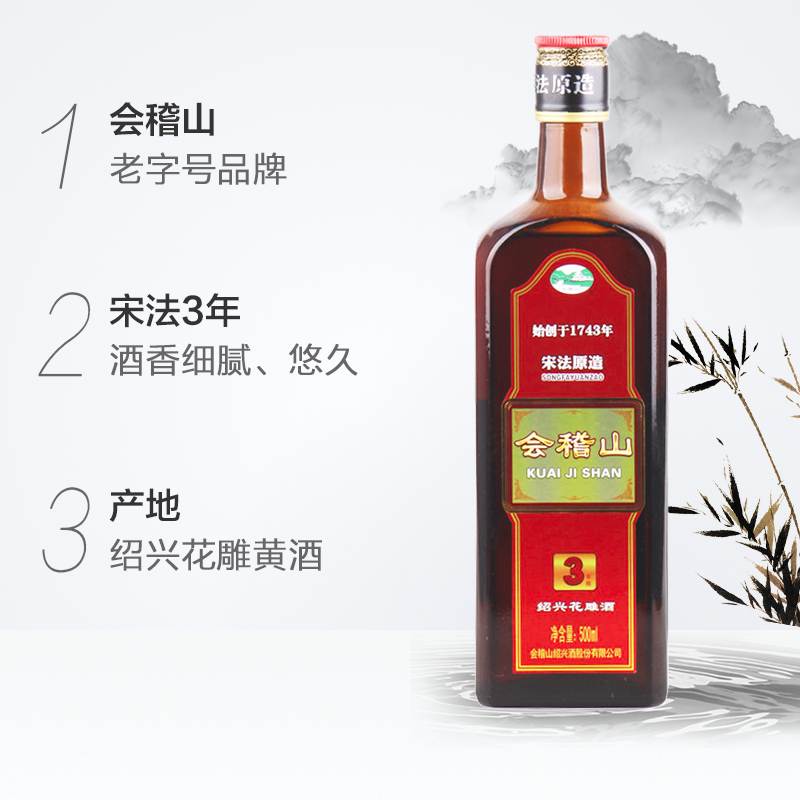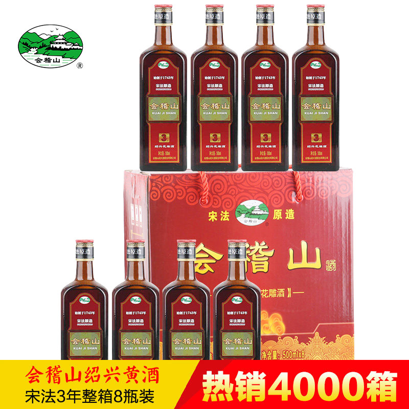 天猫会稽山黄酒纯正宋法三年花雕酒整箱装老酒正品500ml*8瓶绍兴