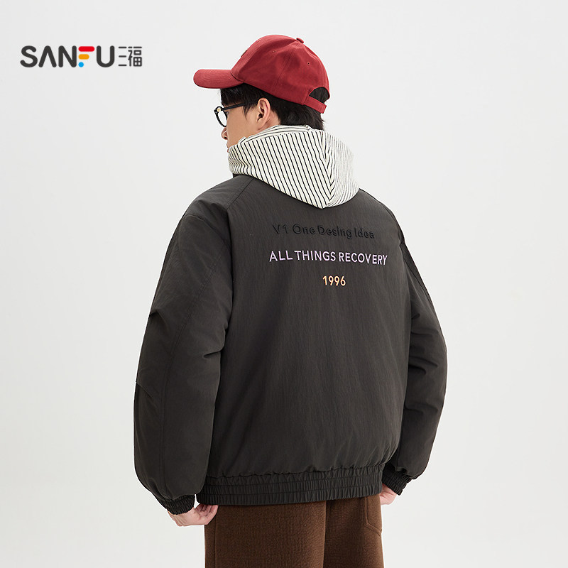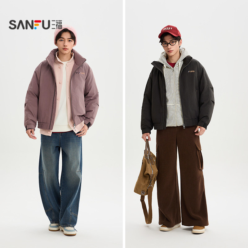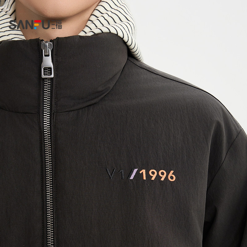 天猫三福2025冬季男士刺绣打褶袖子羽绒服加厚宽松立领宽松外套511718