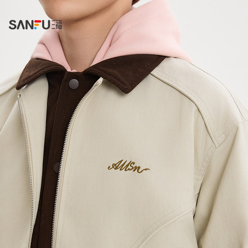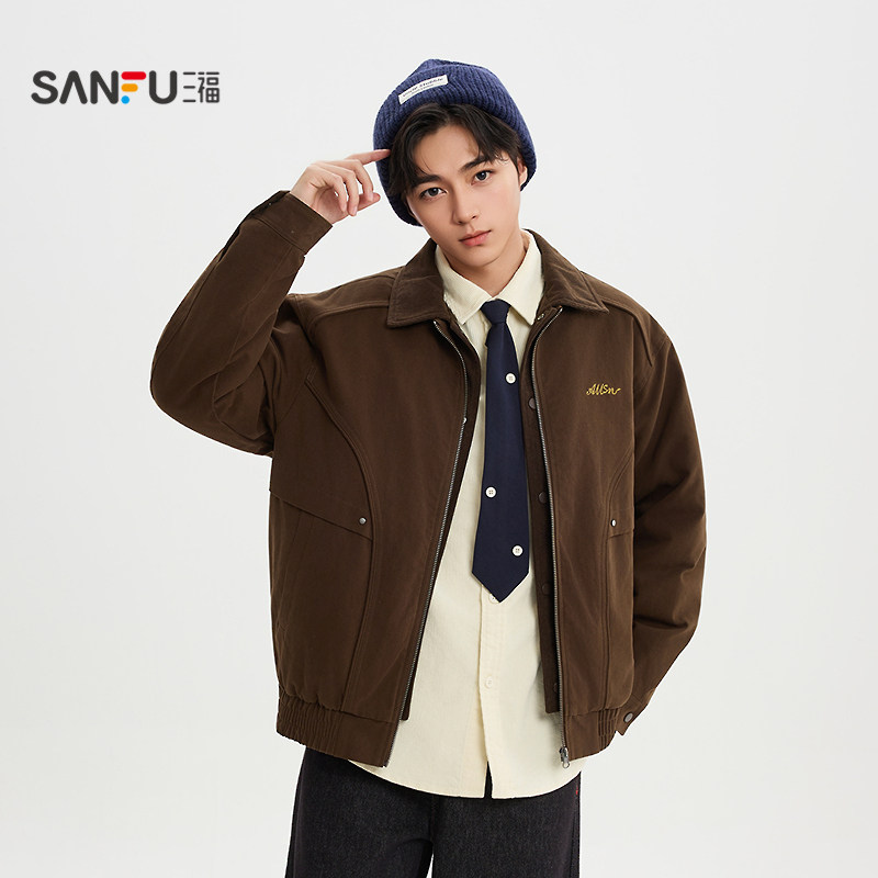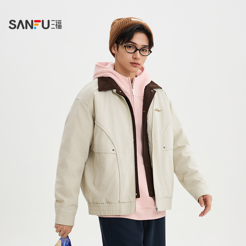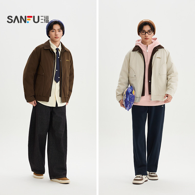 三福2025冬季男士刺绣拼色翻领羽绒服(货号:512582)融合时尚与保暖,采用宽松巴恩风格设计,兼顾舒适与潮流感。衣身以撞色拼接搭配精致刺绣图案,彰显个性品味。高蓬松度羽绒填充,锁温保暖,应对严寒天气。翻领设计利落有型,防风实用,搭配多口袋功能布局,提升日常便利性。外层选用防风耐磨面料,内里细腻亲肤,细节做工精良。无论是通勤还是休闲出行,都能轻松驾驭,是冬季衣橱的理想之选,展现男士低调而不失格调的穿搭态度。