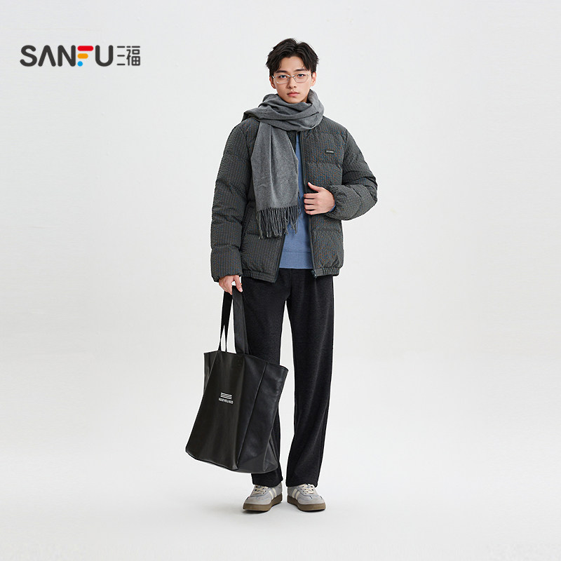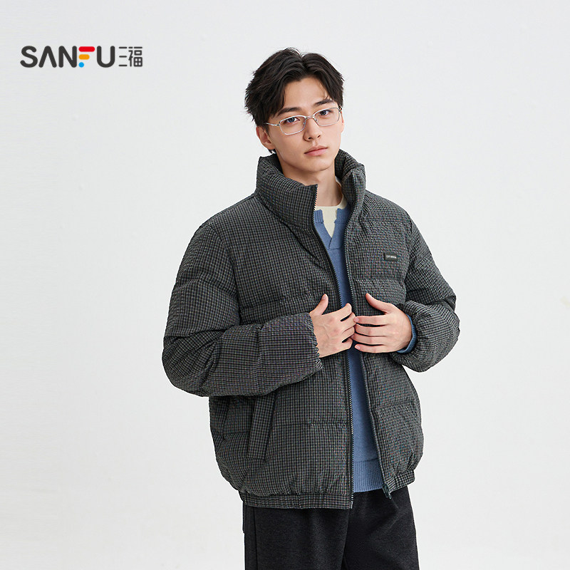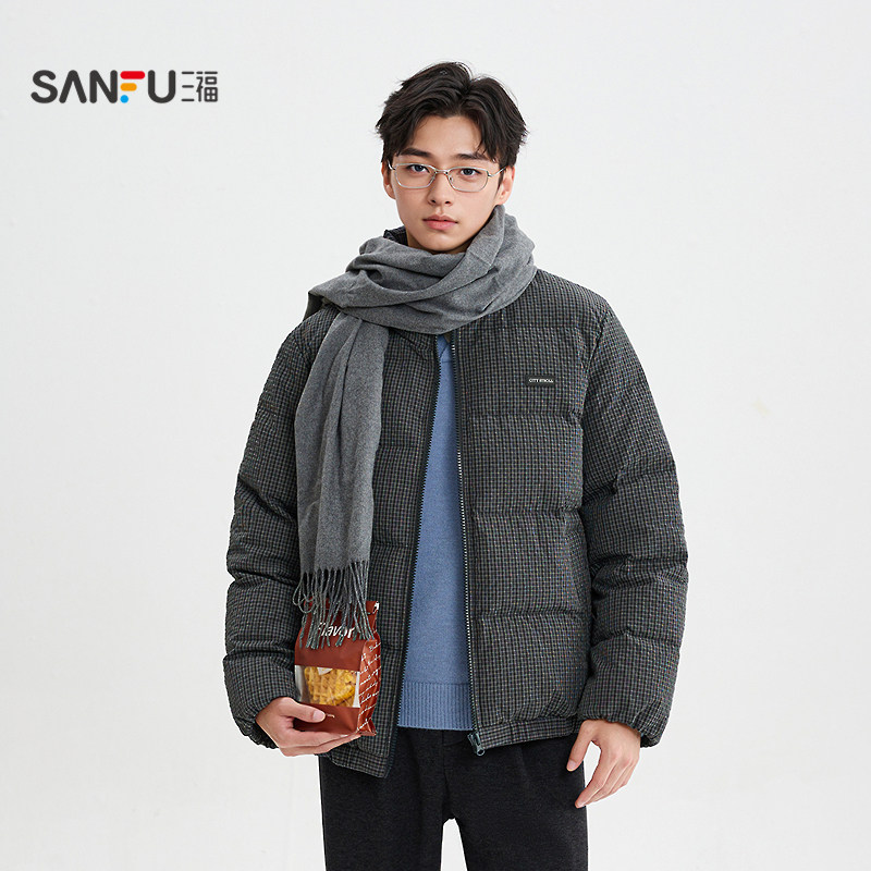 三福2025冬季男士肌理格子羽绒服(款号:511864)融合时尚与保暖,专为都市型男打造。采用高品质防风面料,表面呈现细腻肌理感,搭配经典格子元素,彰显低调复古格调。立领设计有效锁温,抵御寒风侵袭;宽松剪裁兼顾舒适与潮流感,轻松叠穿内搭。填充优质白鸭绒,蓬松轻盈,保暖性能卓越,适合寒冷季节日常通勤或休闲出行。前襟拉链+按扣双重闭合,实用防风。多口袋设计提升收纳便利性。整体简约而不失细节,是冬季衣橱的百搭之选,兼顾温度与风度,展现男士沉稳气质。