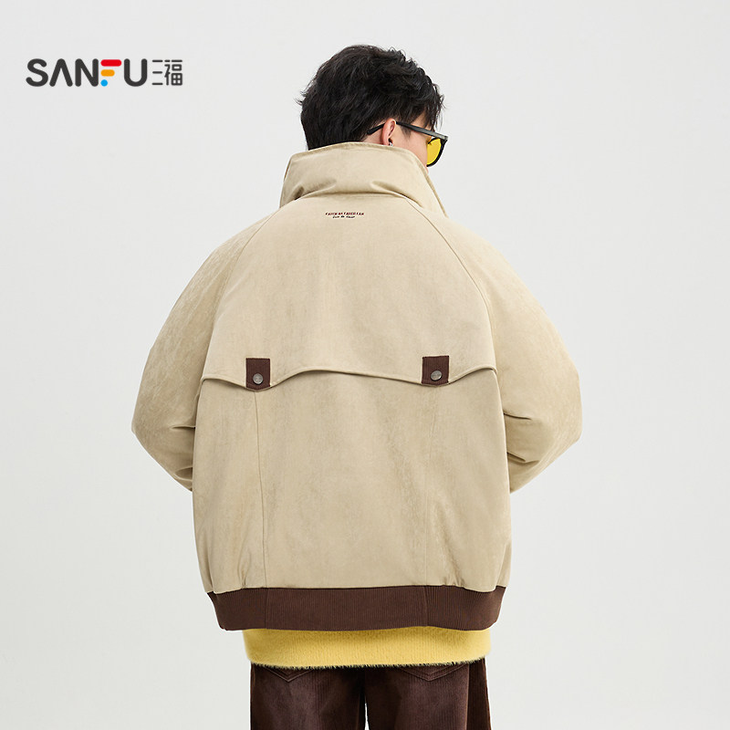 天猫三福2025冬季男士拼色麂皮羽绒服 时尚立领宽松保暖外套513317