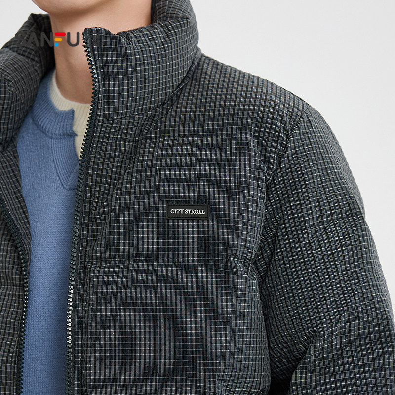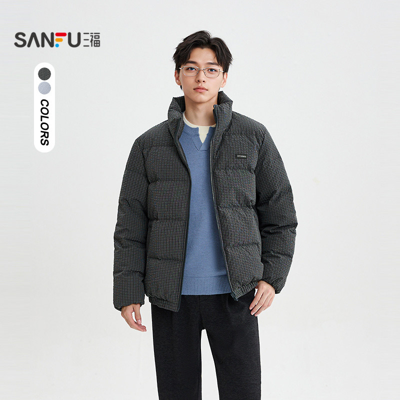 天猫三福2025冬季男士格子短款羽绒服 舒适通勤宽松立领外套512056