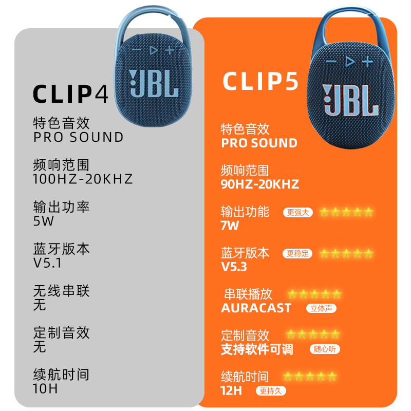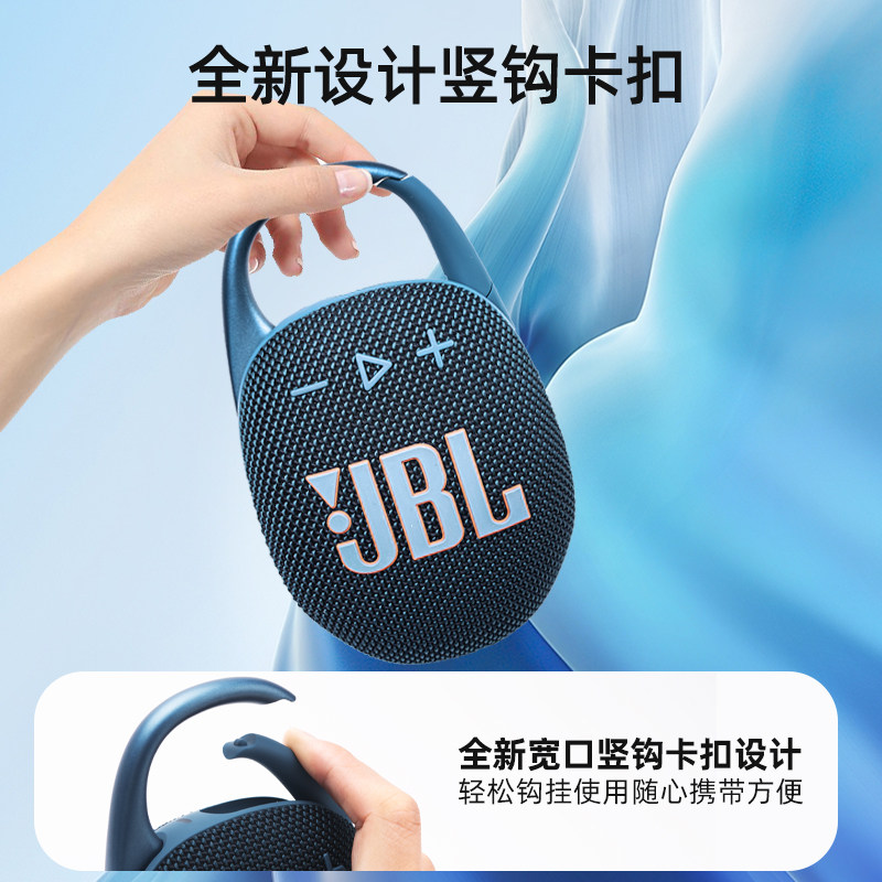 JBL CLIP4 和 CLIP5 是专为户外爱好者设计的迷你无线蓝牙音箱,兼具便携性与出色音质。CLIP4 搭载强劲驱动单元和被动低音辐射器,提供清晰饱满的 JBL 标志性音效,续航长达10小时,IP67防水防尘,可轻松应对各种户外环境。其内置登山扣设计,可牢固挂于背包或腰带,解放双手。全新 CLIP5 在音质和续航上进一步升级,低频更澎湃,播放时间延长至12小时,并支持 PartyBoost 功能,可多台串联打造立体声场。两款均支持蓝牙5.1快速连接,操作简便。无论是徒步、露营还是日常通勤,JBL CLIP 系列都是随身音乐的理想伴侣。