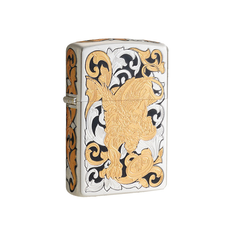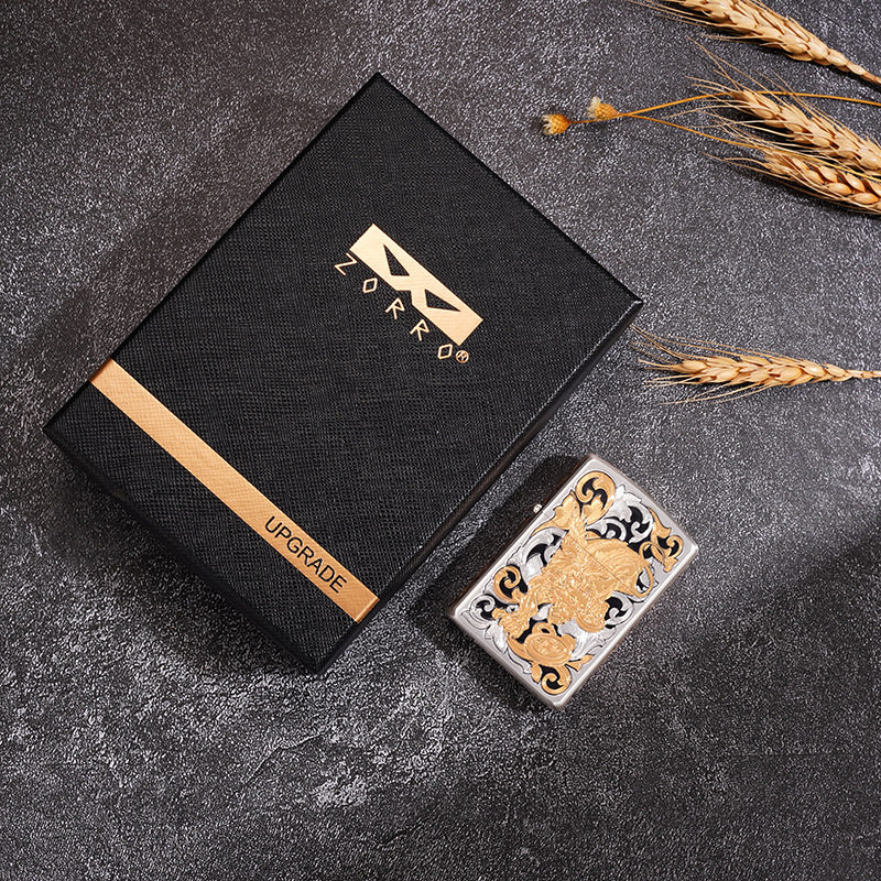 二代佐罗Z2-1169银黑金唐草貔貅煤油打火机,融合东方瑞兽貔貅与古典唐草纹饰,采用银黑金三色电镀工艺,质感奢华,尽显高档品味。机身精工雕刻,细节繁复,寓意招财纳福、护佑平安。配备防风设计,火焰稳定,适应多种环境使用。优质黄铜材质,搭配精密加油系统,持久耐用。无论是收藏、自用还是馈赠亲友,皆彰显独特个性与尊贵气质。佐罗品牌经典传承,Z2-1169将艺术与实用完美结合,是现代男士彰显品位的理想之选。