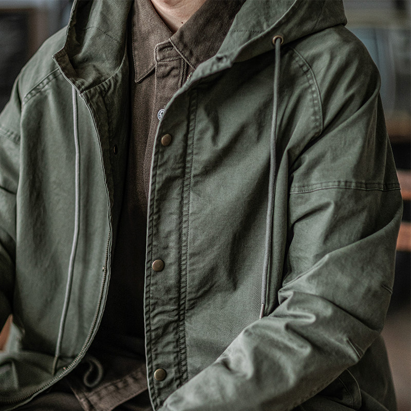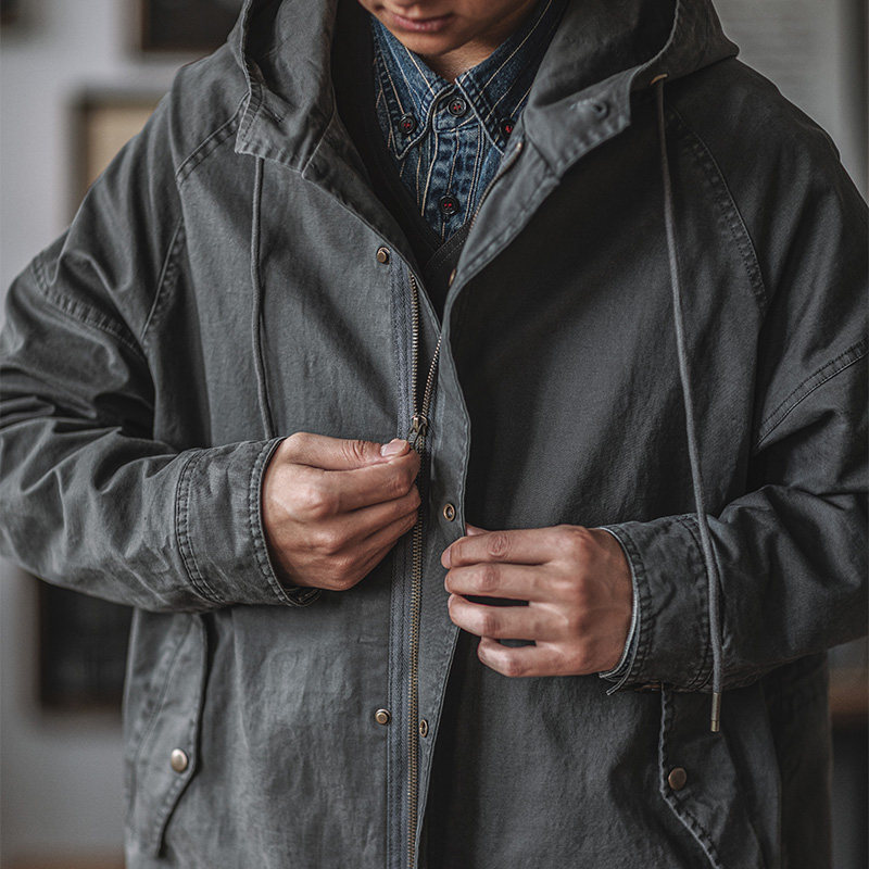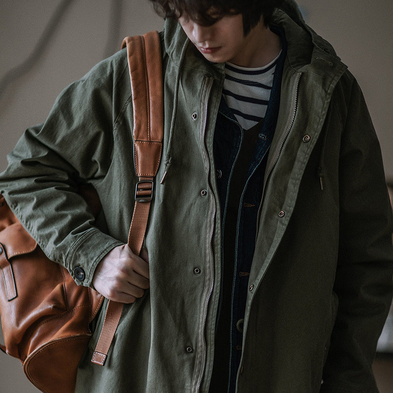 这款美式复古M51军绿风衣,完美融合经典军旅风格与阿美咔叽(Amekaji)工装美学。采用厚重耐磨的棉质斜纹面料,军绿色调复古耐看,中长款鱼尾设计源自上世纪50年代美军派克大衣,下摆微扩,兼具防风功能与视觉张力。立体剪裁搭配多口袋工装细节,实用且富有层次感。门襟拉链加按扣双重闭合,保暖性强,适合秋冬日常通勤或户外穿搭。整体风格硬朗却不失质感,是追求复古工装风的男士衣橱必备单品,轻松打造美式街头或City Boy造型。