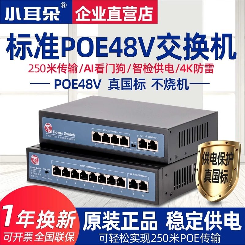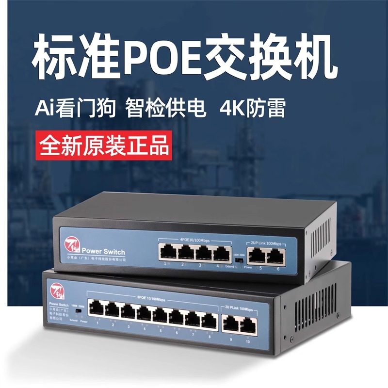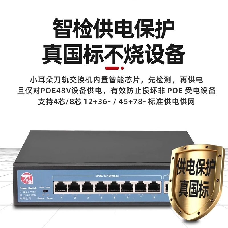 小耳朵4口/8口百兆POE交换机是一款专为监控系统设计的智能网络交换设备,支持IEEE 802.3af/at国标POE供电标准,采用48V安全电压,可通过网线为摄像头、无线AP等终端设备同时传输数据与电力,简化布线、降低成本。设备提供4或8个百兆POE端口及1个百兆上行端口,即插即用,支持自动识别供电设备,具备过载、短路、防雷等多重保护功能,工作稳定可靠。适用于家庭、商铺、小型企业等场景的安防监控组网,安装便捷,性能高效,是构建经济型智能监控系统的理想选择。