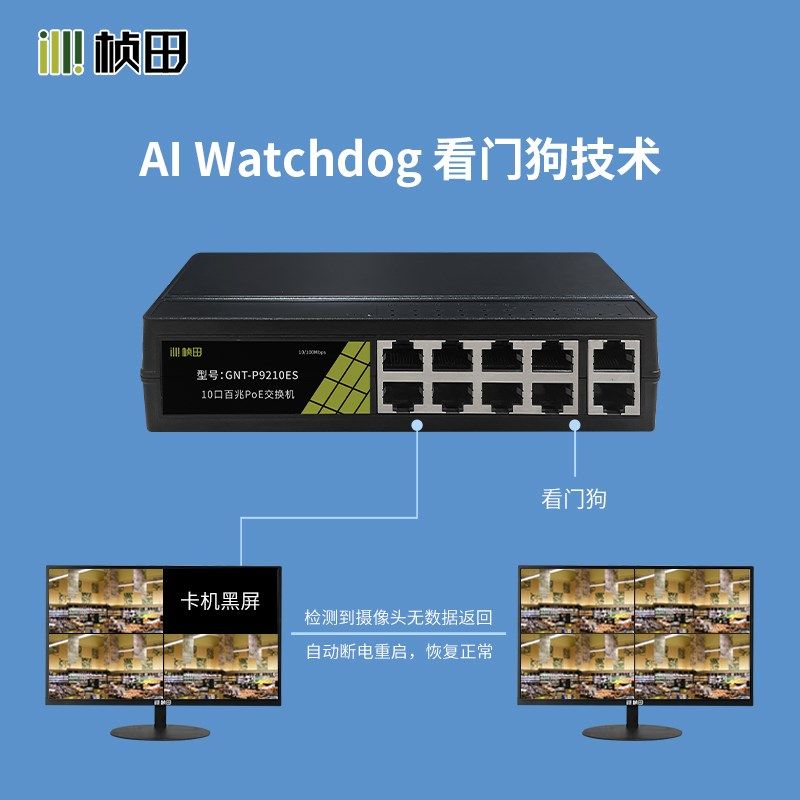 桢田8+2国标智能POE交换机GNT-P9210ES是一款高性能10口网络集线器,支持8个百兆POE供电端口和2个千兆上行端口,符合IEEE 802.3af/at国际标准,可为摄像头、无线AP、IP电话等设备提供稳定48V远程供电与数据传输。采用智能供电管理,具备过载、短路、防雷保护功能,安全可靠。支持即插即用,兼容性强,适用于家庭、商铺、中小企业等场景。金属外壳设计,散热优良,支持壁挂安装,部署灵活。GNT-P9210ES集高效供电、高速传输与智能管理于一体,是构建稳定、节能、智能网络系统的理想选择。
