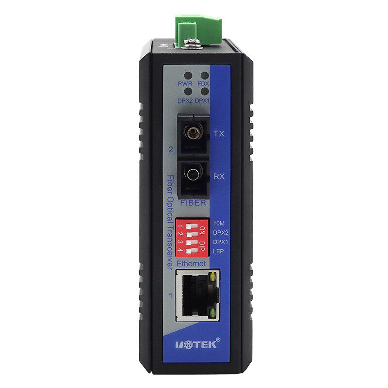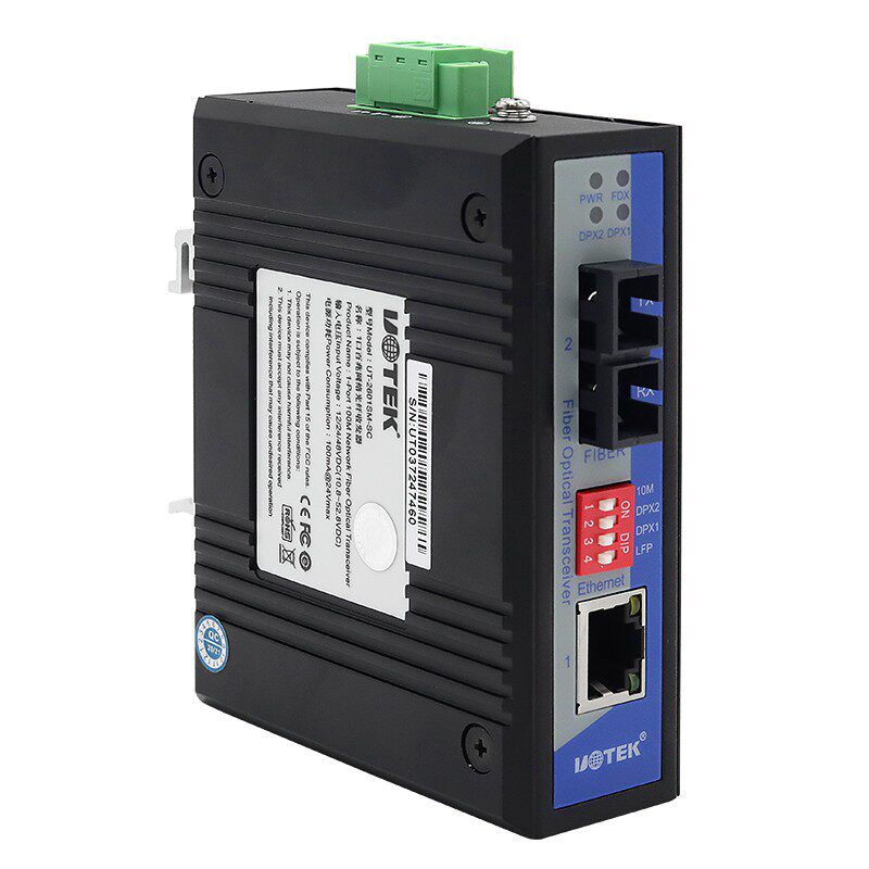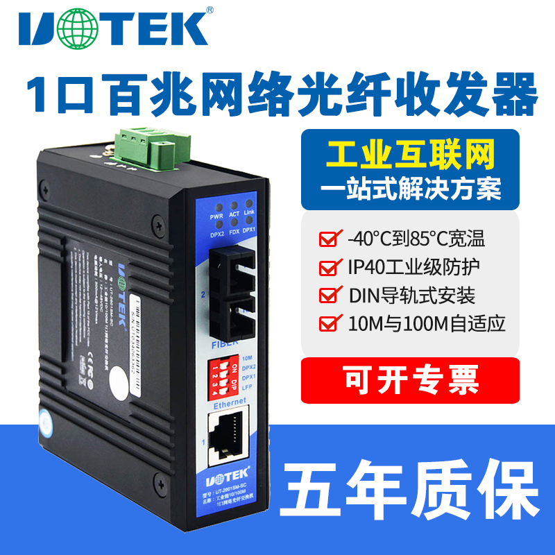 UTEK/宇泰UT-2601SM-SC是一款工业级百兆光纤收发器,支持1光1电端口,实现电口(RJ45)与单模光纤(SC接口)之间的双向数据转换。采用自适应设计,兼容10/100Mbps网络速率,确保与各类设备无缝对接。产品具备宽电压输入(DC 12~48V),适应复杂工业环境,支持DIN导轨安装,便于集成部署。具备防雷、防浪涌及电磁干扰防护,工作温度范围宽(-40℃~75℃),可靠性高,适用于电力、交通、安防等严苛场景。通过光纤传输有效延长通信距离(最远可达20公里),提升网络稳定性与抗干扰能力,是工业网络升级的理想选择。