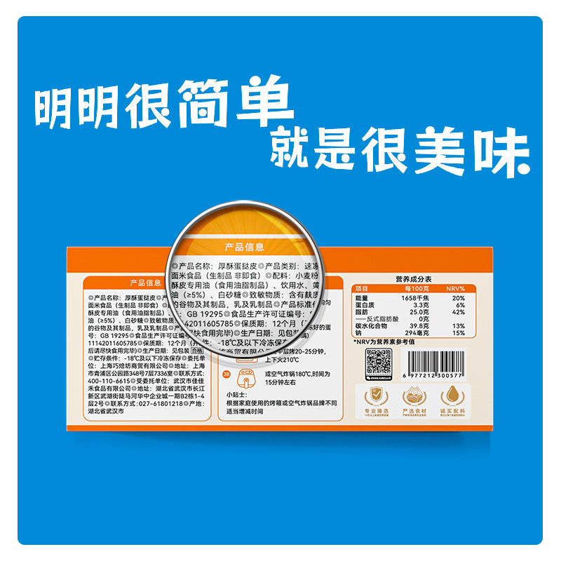 展艺厚酥葡式蛋挞皮挞液套餐,专为家庭烘焙爱好者打造,精选优质原料,无人工添加剂,健康安心。套餐包含酥脆挞皮与浓郁挞液,搭配科学,无需调配,开袋即用,轻松制作正宗葡式蛋挞。特别适合空气炸锅操作,15分钟即可出炉,外皮金黄酥脆,内馅嫩滑香甜,媲美专业茶餐厅品质。展艺旗舰店直供,品质有保障,是居家下午茶、聚会甜点的理想选择。省时省力,新手也能轻松上手,享受烘焙乐趣的同时,为家人带来美味惊喜。