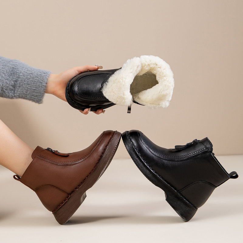 这款短靴采用皮毛一体设计,内里为优质羊毛,外层为头层真皮,保暖透气,柔软舒适,特别适合中老年女性在冬季穿着。加厚棉质内里有效锁温,抵御严寒,同时具备良好的吸湿排汗性能,保持双脚干爽。鞋面简约大方,搭配经典短靴造型,既显气质又百搭。防滑耐磨橡胶大底,抓地力强,行走更安心,尤其适合雨雪天气。鞋口加高设计,护踝保暖,穿脱便捷。整体轻便不累脚,长时间行走也无负担。专为妈妈级用户贴心打造,兼顾保暖、舒适与安全,是冬季出行的理想之选。