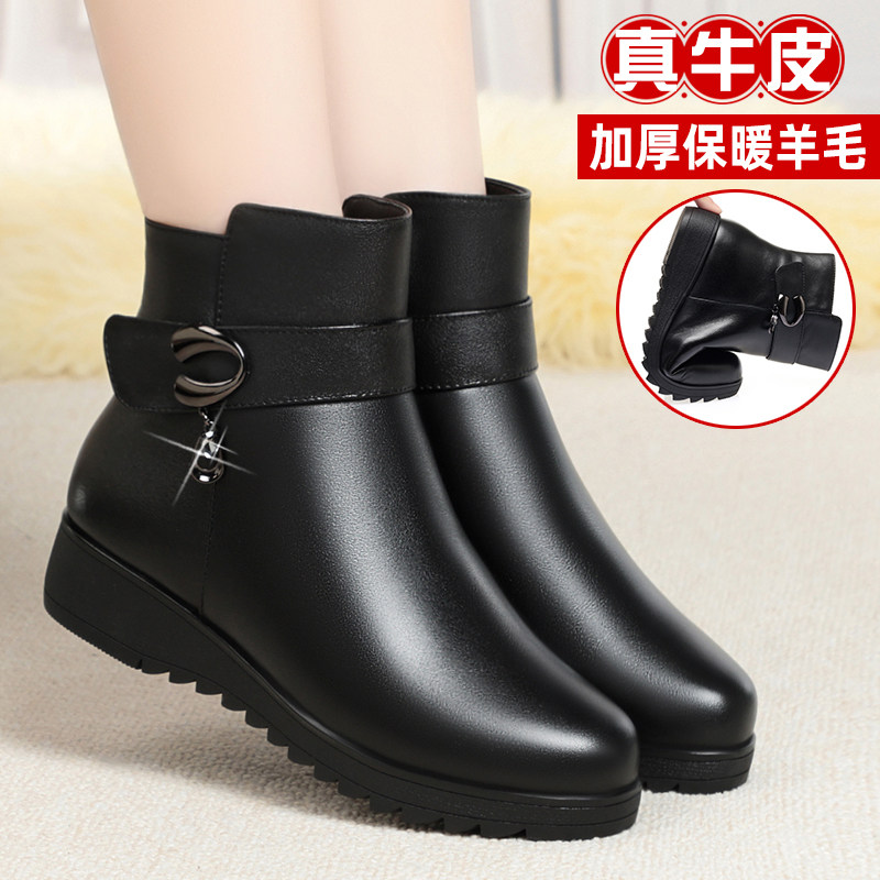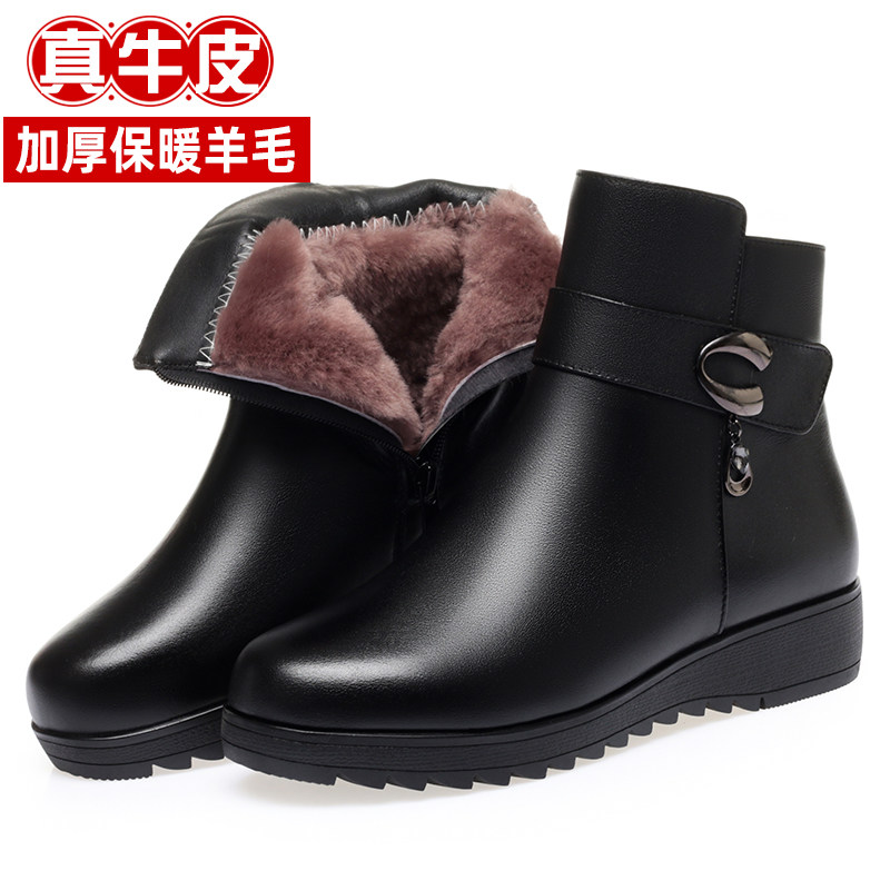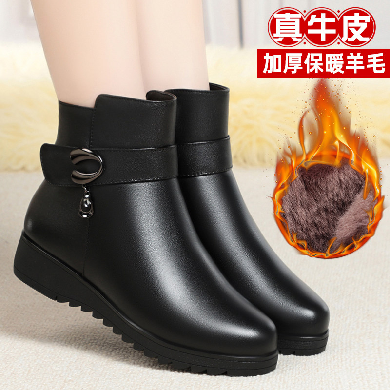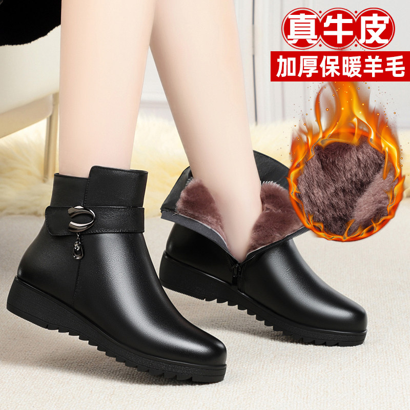 天猫真皮妈妈棉鞋冬季加绒加厚女鞋子中老年防滑软底短靴女士羊毛皮鞋