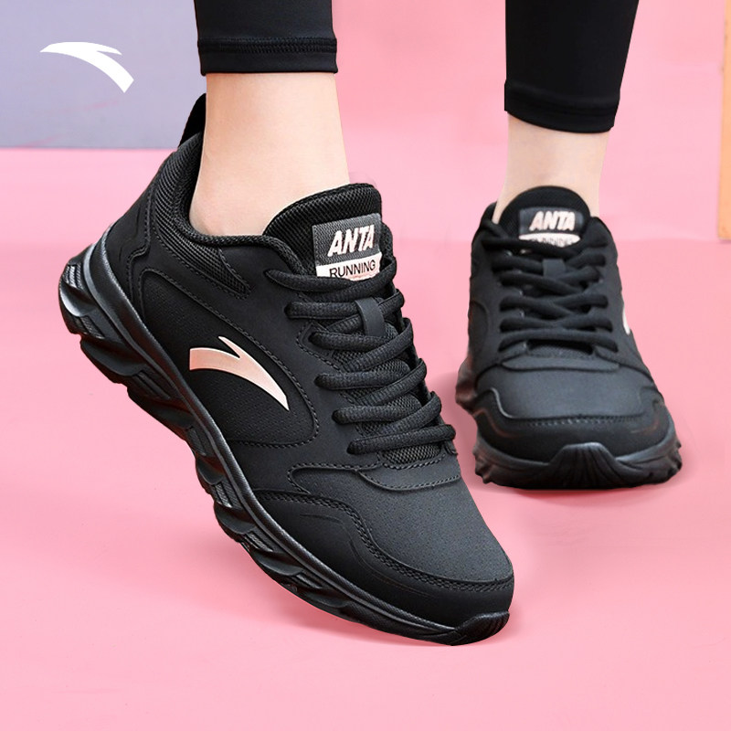 天猫安踏女鞋黑色运动鞋中年妈妈女款防滑鞋子防水鞋皮面跑步鞋旅游鞋