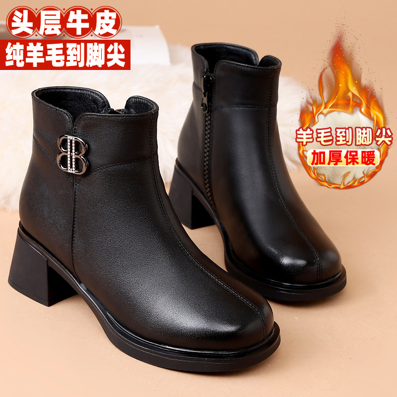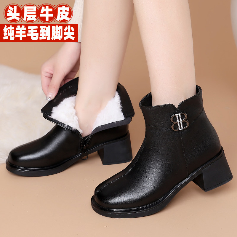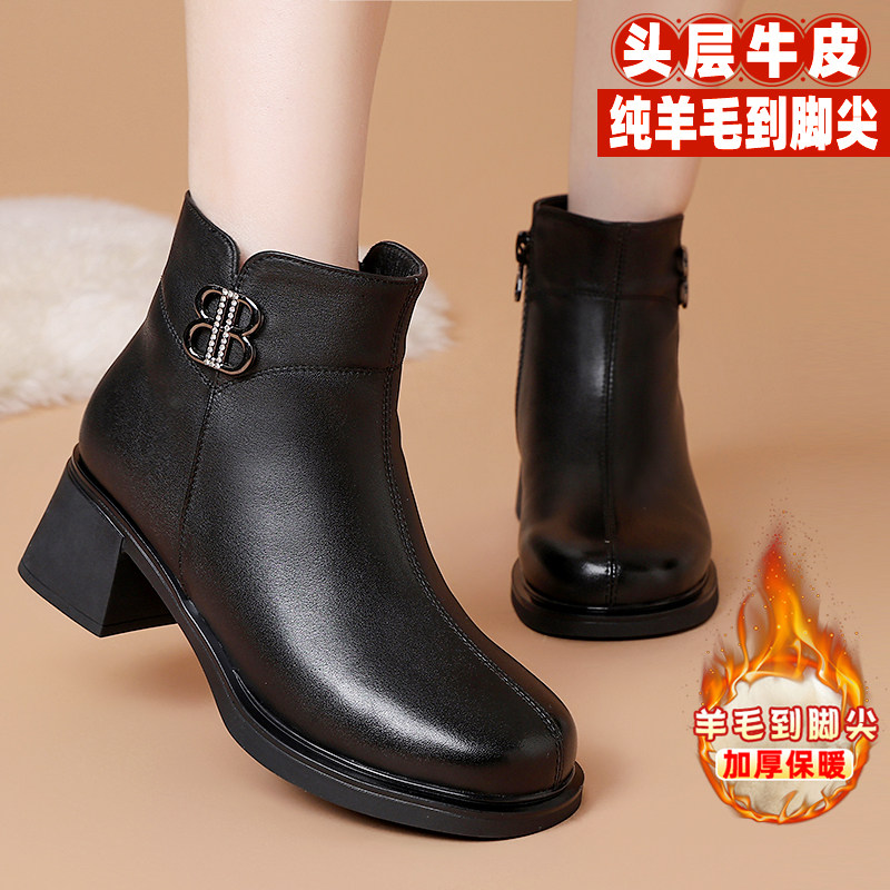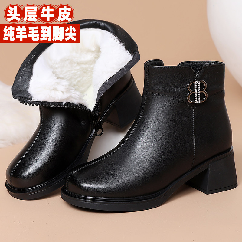 天猫真皮靴子短靴秋冬加绒妈妈鞋子高跟中年女靴棉鞋软底防滑羊毛皮鞋