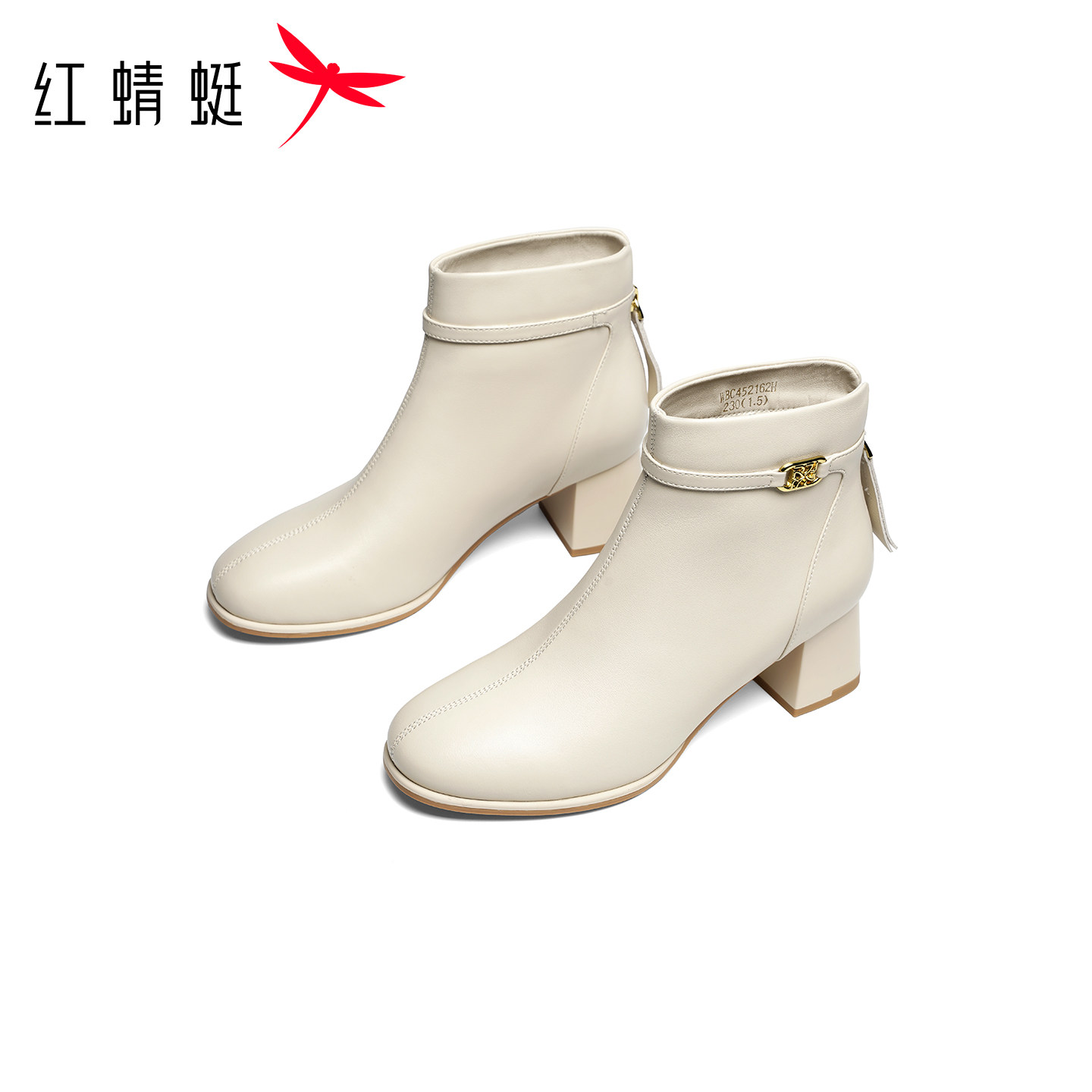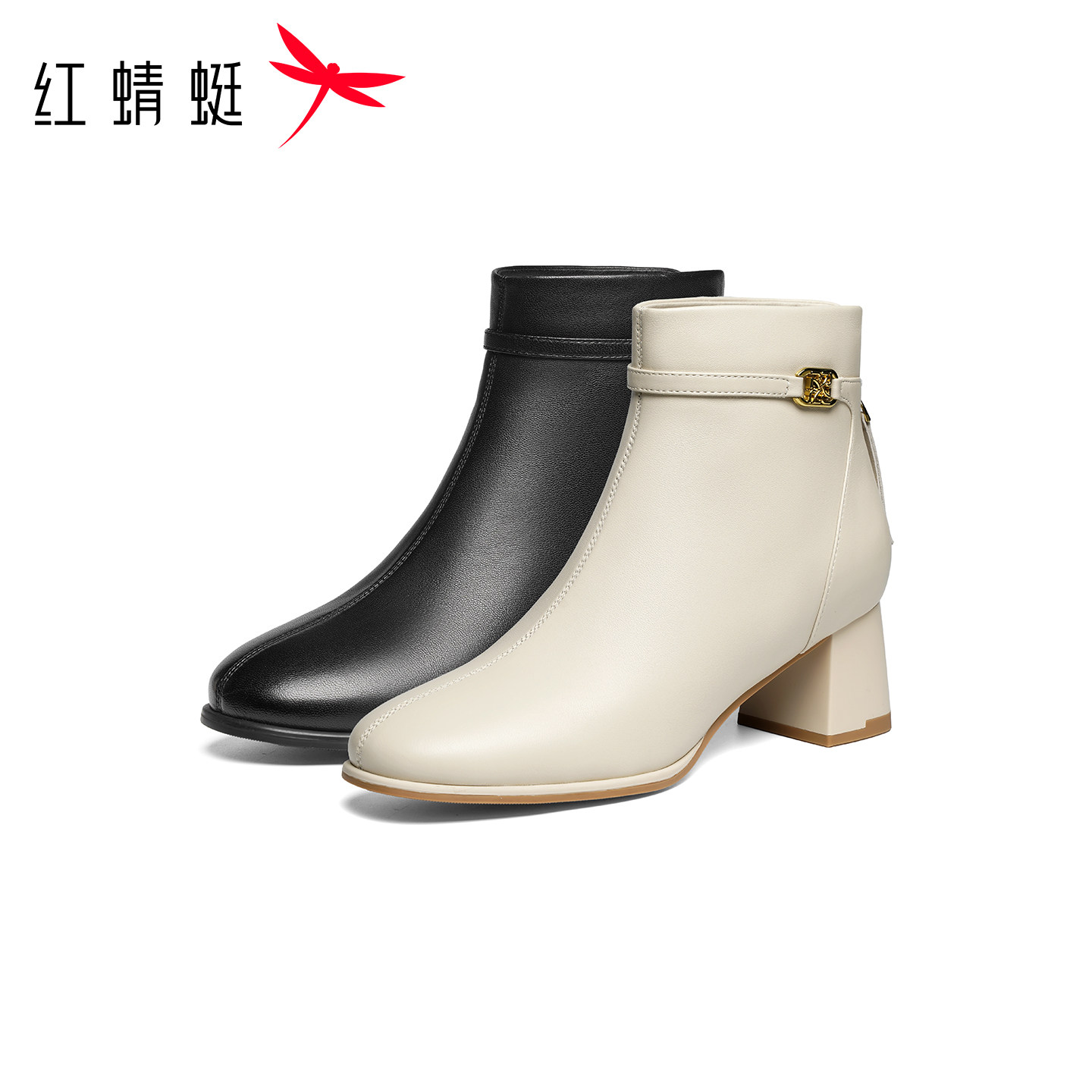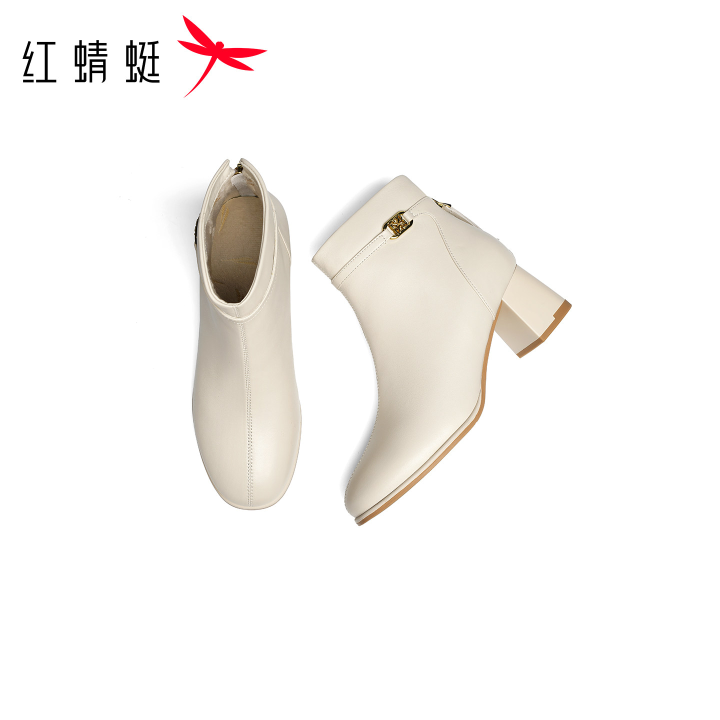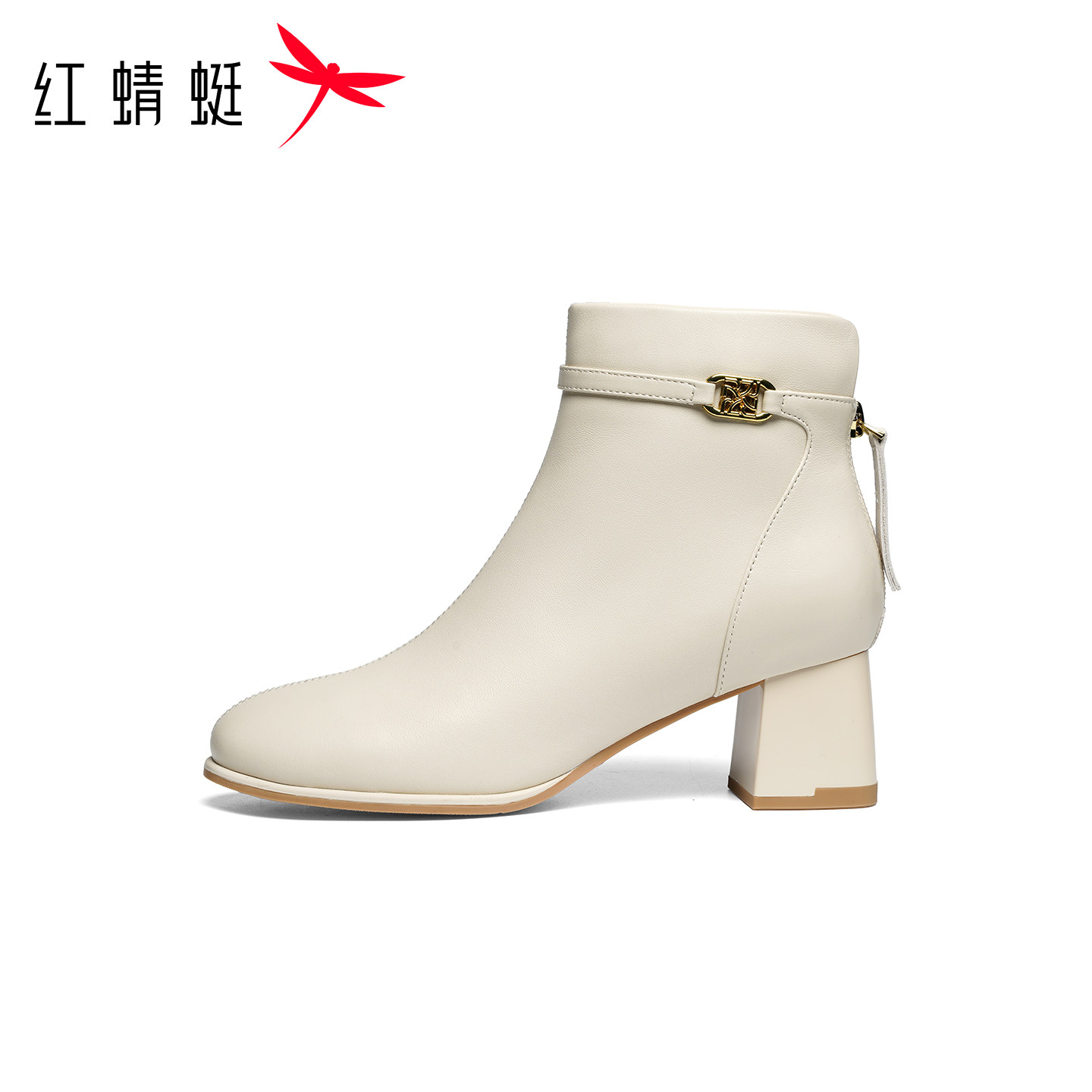 天猫红蜻蜓高跟妈妈鞋子2025冬季女鞋白色粗跟女靴加绒皮鞋羊皮短靴子