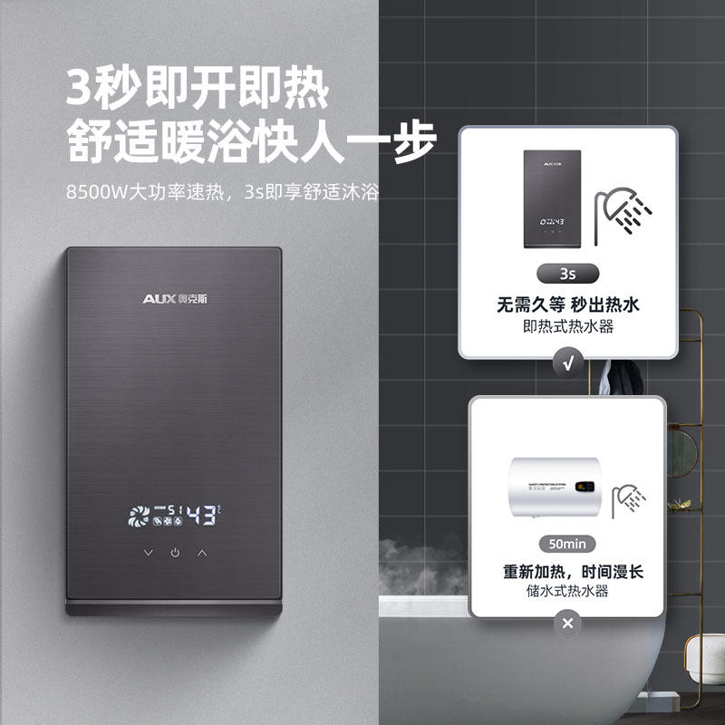 奥克斯即热式电热水器是一款专为家庭卫生间设计的新型速热淋浴器,采用先进的变频恒温技术,实现即开即热,无需等待预热,大幅提升洗浴体验。其小巧机身节省空间,适合各类小户型卫生间安装。内置智能温控系统,精准调节水温,避免忽冷忽热,保障舒适沐浴。同时具备多重安全保护,如防漏电、防干烧、防超压等,使用更安心。节能高效,按需加热,减少能源浪费。奥克斯凭借可靠品质与人性化设计,为用户带来便捷、安全、舒适的现代洗浴解决方案,是提升家居生活品质的优选家电。
