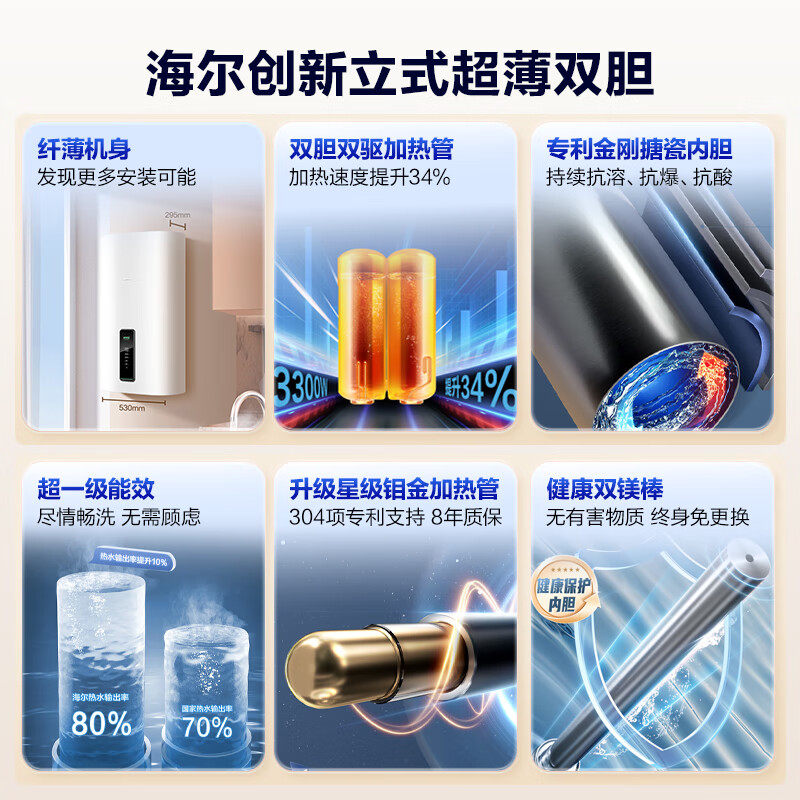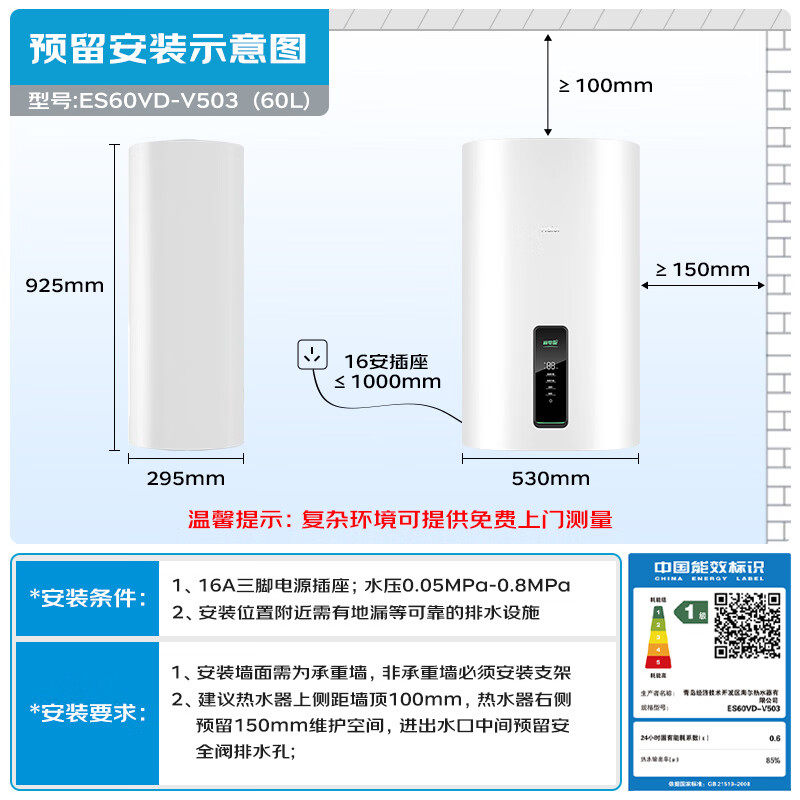 海尔电热水器V503系列,专为家庭洗浴设计,提供60L、100L、150L多种容量选择,立式竖装节省空间,适配不同户型需求。采用高效速热技术,加热迅速,热水即用即享,一级能效节能环保,降低日常使用成本。内胆搭载金刚三层胆科技,抗腐蚀、耐高温,持久耐用。配备多重安全防护系统,包括防电墙、防干烧、超温保护等,使用更安心。智能预约功能可提前设定加热时间,回家即可享受舒适热水。简约操控面板,操作便捷,适合全家人使用。海尔V503以稳定性能、安全可靠和人性化设计,成为现代家庭洗浴的理想之选。
