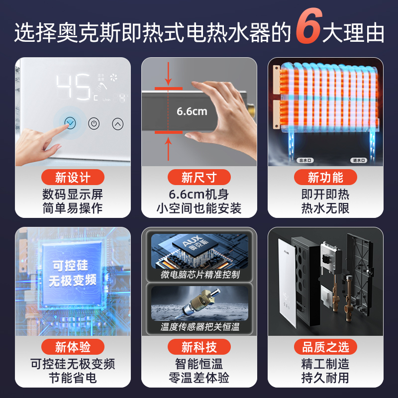 奥克斯即热式电热水器是一款专为现代家庭设计的小型变频恒温速热淋浴设备,采用先进的即热技术,无需储水预热,开机即出热水,节能高效。搭载智能变频控制系统,可根据进水温度自动调节功率,实现精准恒温,告别水温忽冷忽热。体积小巧,安装便捷,适合卫生间空间有限的家庭。具备多重安全防护,如防漏电、防干烧、防超温等,使用更安心。低噪音运行,提升沐浴舒适度。奥克斯以创新科技和人性化设计,为用户带来便捷、舒适、安全的洗浴体验,是升级家居热水生活的理想之选。