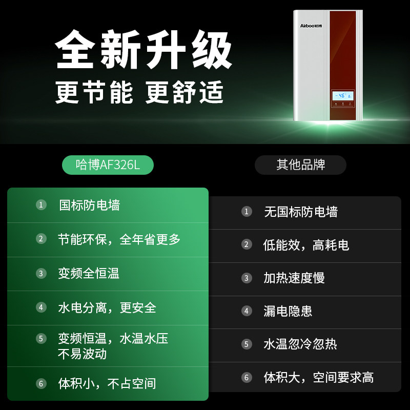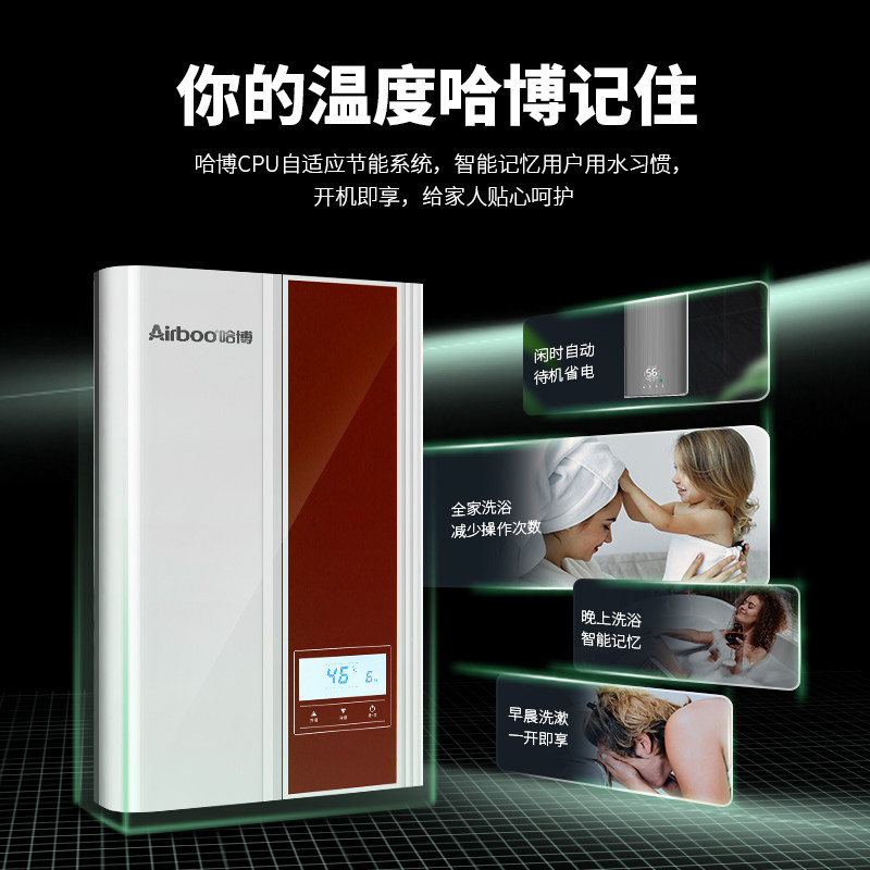 Airboo哈博即热式电热水器是一款专为家庭设计的小型速热淋浴设备,采用先进的即热技术,无需储水预热,打开即出热水,节能高效。配备智能恒温系统,精准控制水温,避免忽冷忽热,洗浴更舒适安全。机身小巧轻便,安装灵活,节省空间,适合多种户型使用。内置多重安全防护,包括防漏电、防干烧、防超温等,保障家人使用安全。即开即热、无需等待的设计,大幅提升用水便利性,是现代家庭追求高效舒适生活的理想选择。Airboo哈博以稳定性能与贴心设计,为用户带来便捷、节能、安全的热水体验。