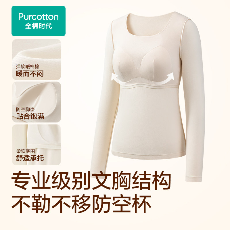 天猫全棉时代保暖背心女打底衫圆领无袖发热防寒内搭肌底衣带胸垫内衣