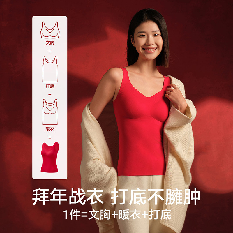天猫松山棉店小暖羊带胸垫保暖背心女士打底衫加绒内衣保暖内衣冬红色