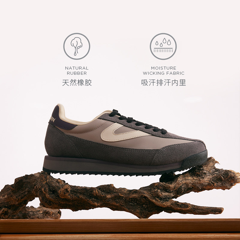 瑞典品牌TRETORN推出的秋冬款女款休闲鞋,以经典复古德训鞋为灵感,融合当下流行的美拉德(Maillard)配色,呈现温暖醇厚的棕褐、焦糖与奶咖色调,质感高级且极具秋冬氛围。鞋面采用优质皮革与透气织物拼接,兼顾舒适度与耐用性,搭配标志性侧边条纹设计,简约中彰显北欧极简美学。低帮版型轻盈百搭,橡胶大底防滑耐磨,适合日常通勤或休闲出行。无论是搭配牛仔裤、针织裙还是风衣,都能轻松打造复古时髦的都市造型。TRETORN以环保理念与精湛工艺著称,这款美拉德阿甘鞋不仅是时尚单品,更诠释可持续生活方式的优雅选择。