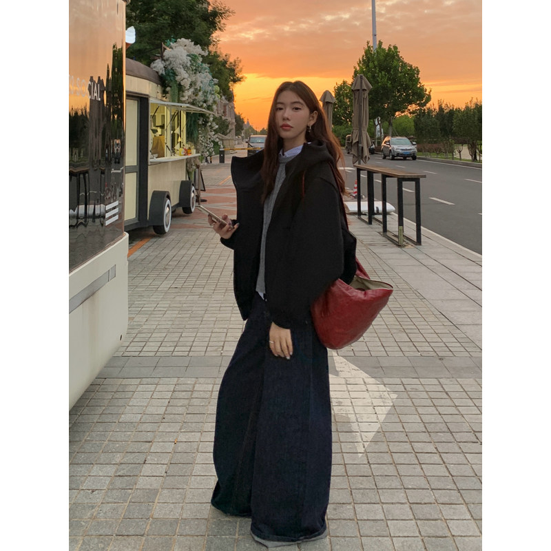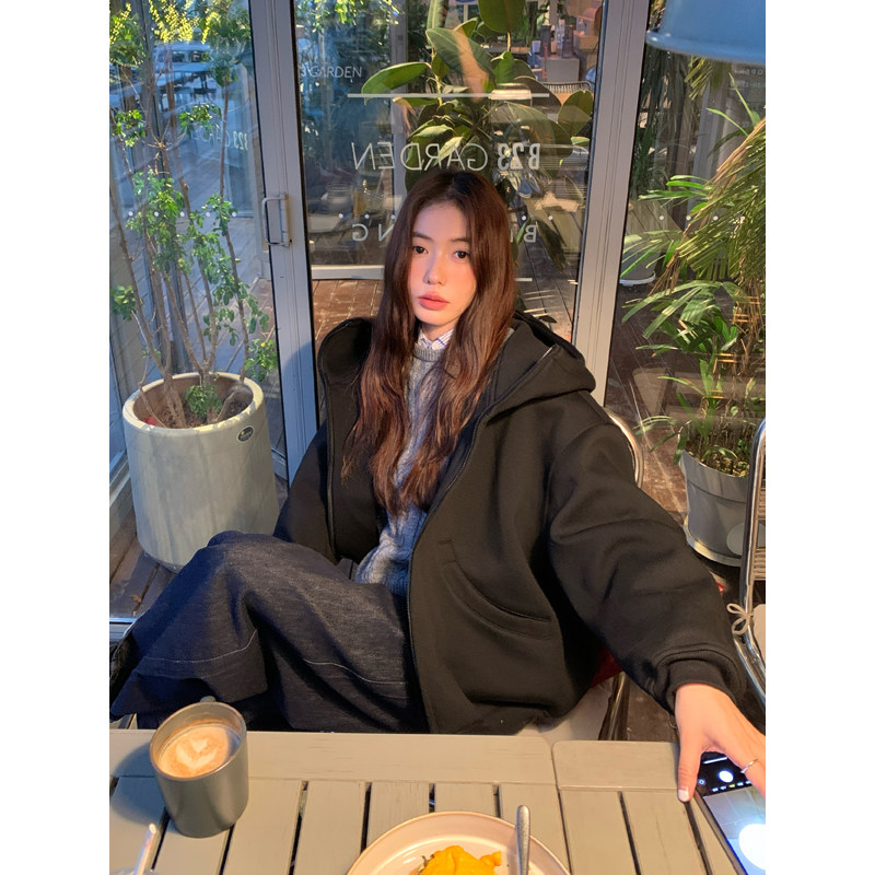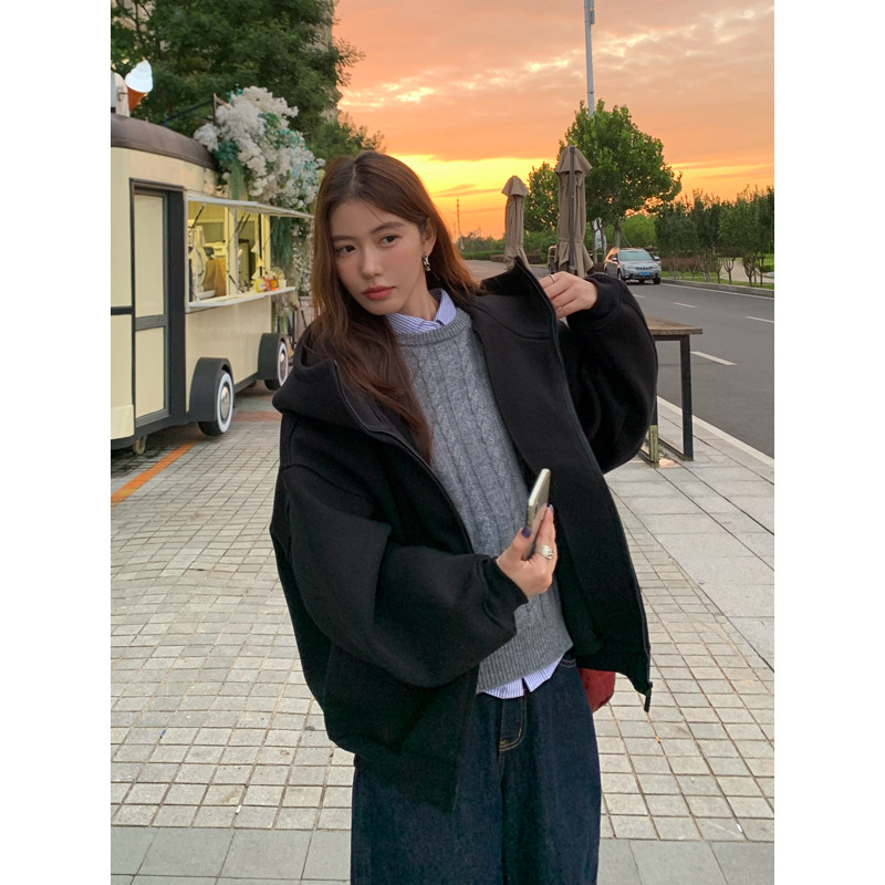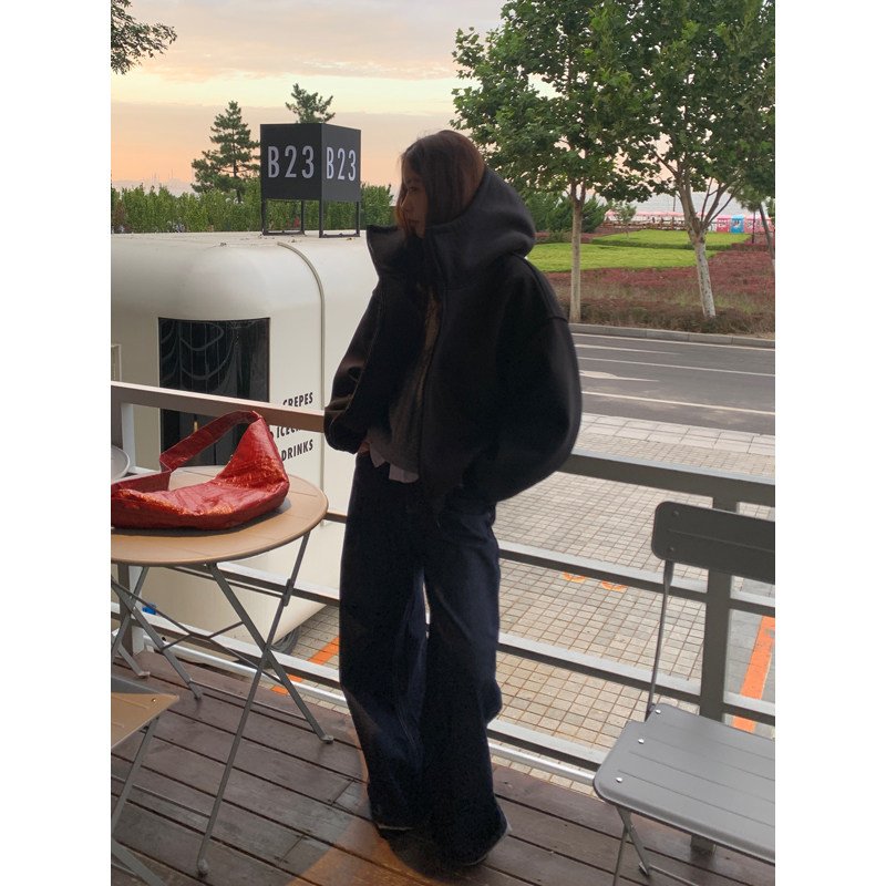 淘宝Halo Luu 黑色运动连帽卫衣女秋季2025新款廓形空气棉拉链厚外套