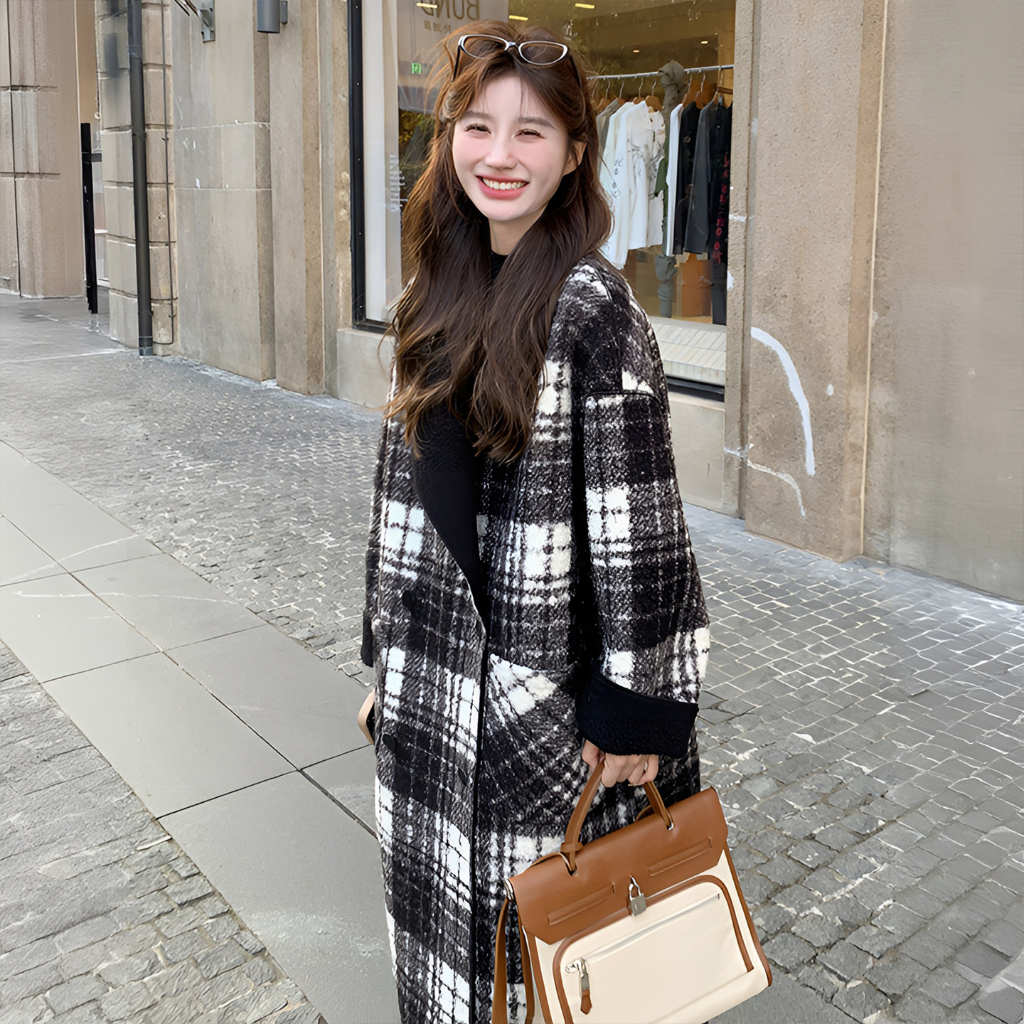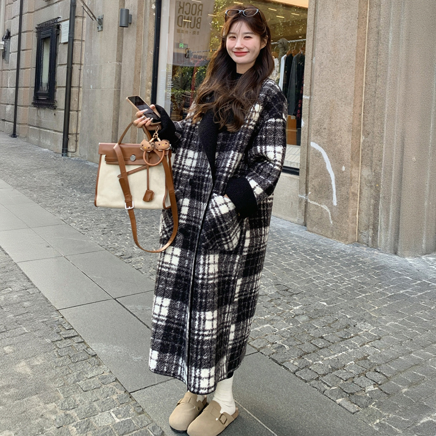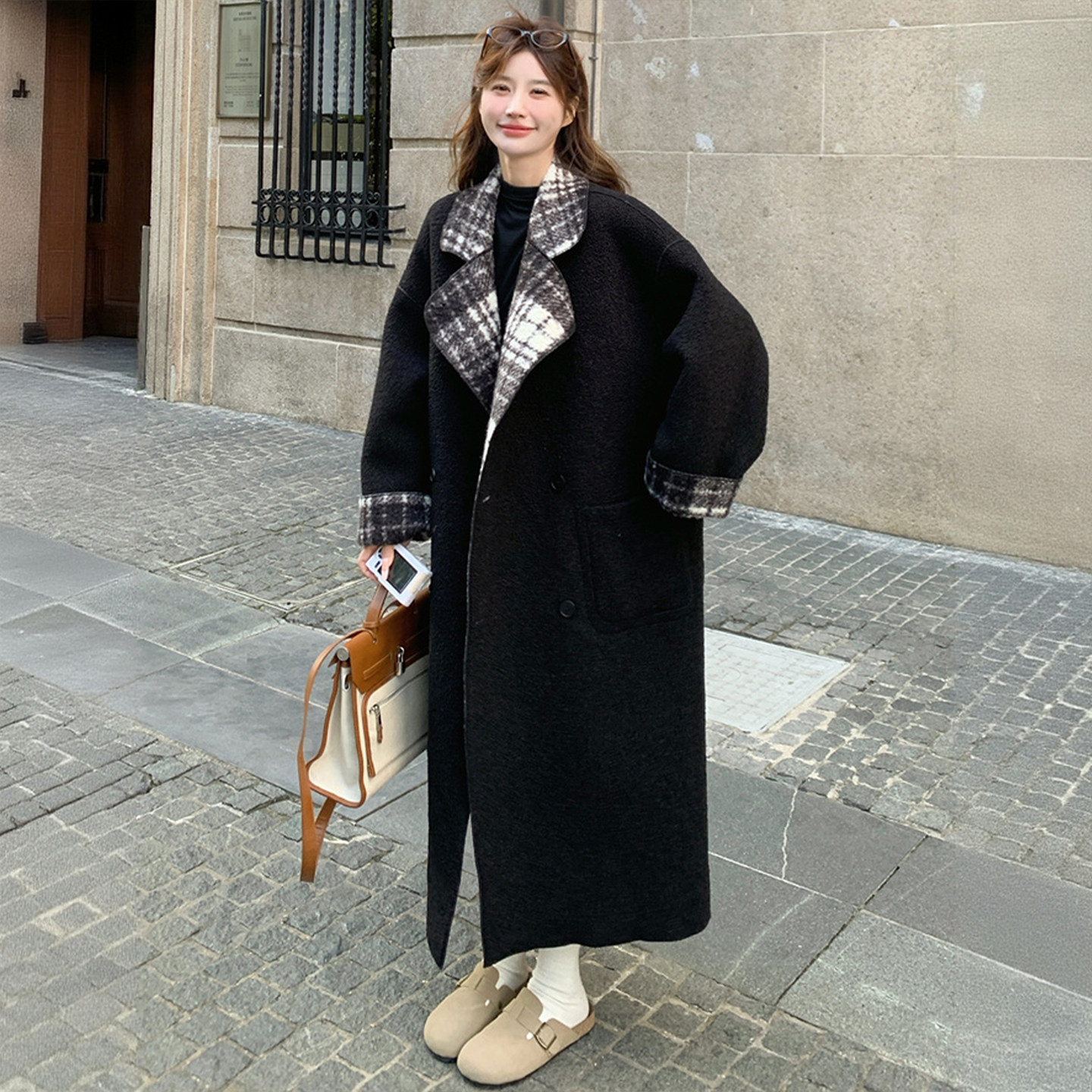 淘宝胖mm大码女装气质百搭毛呢外套女慵懒风高级感格子拼接双面穿大衣