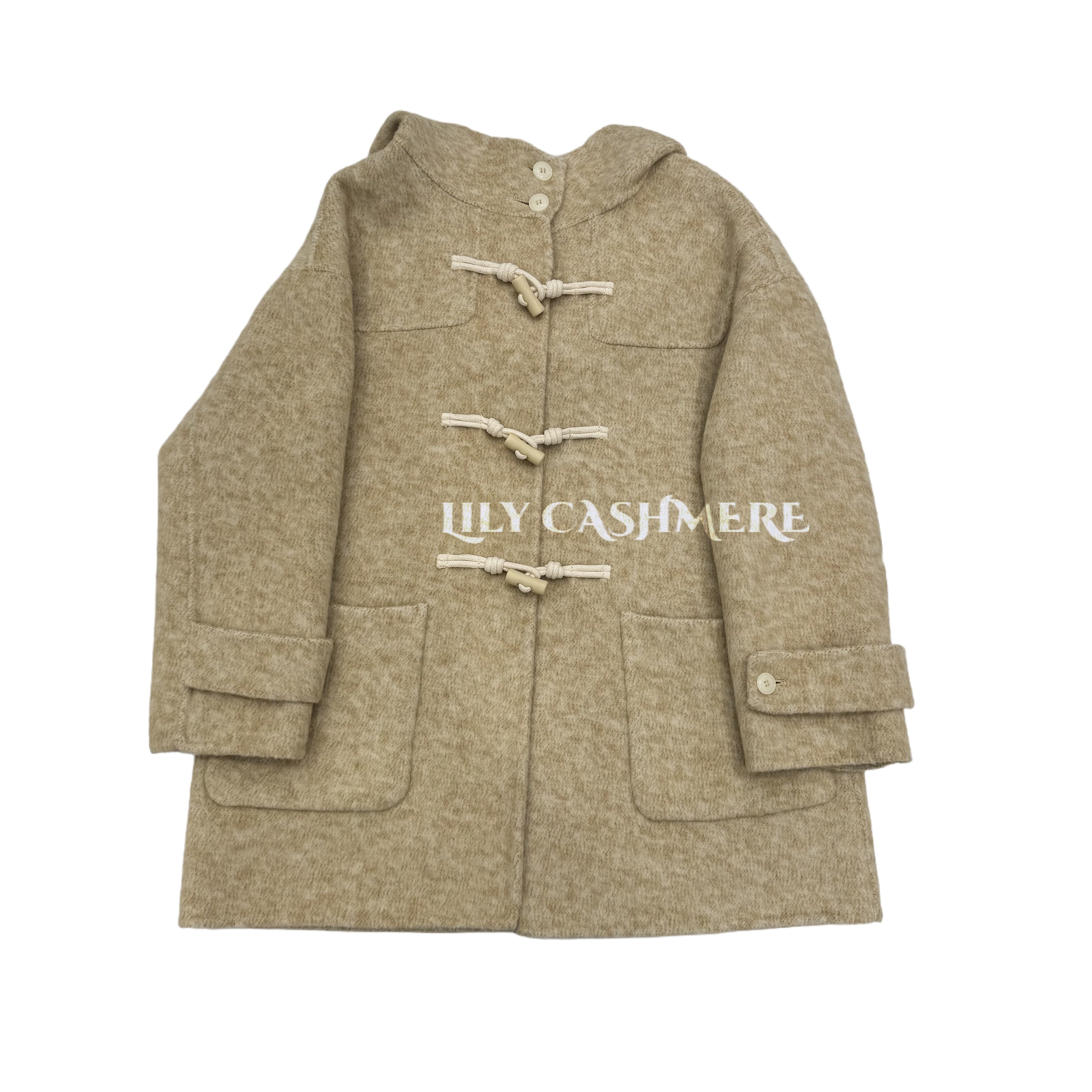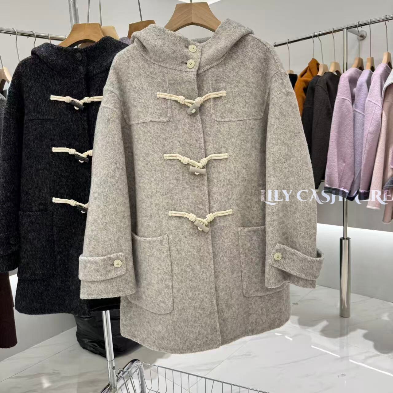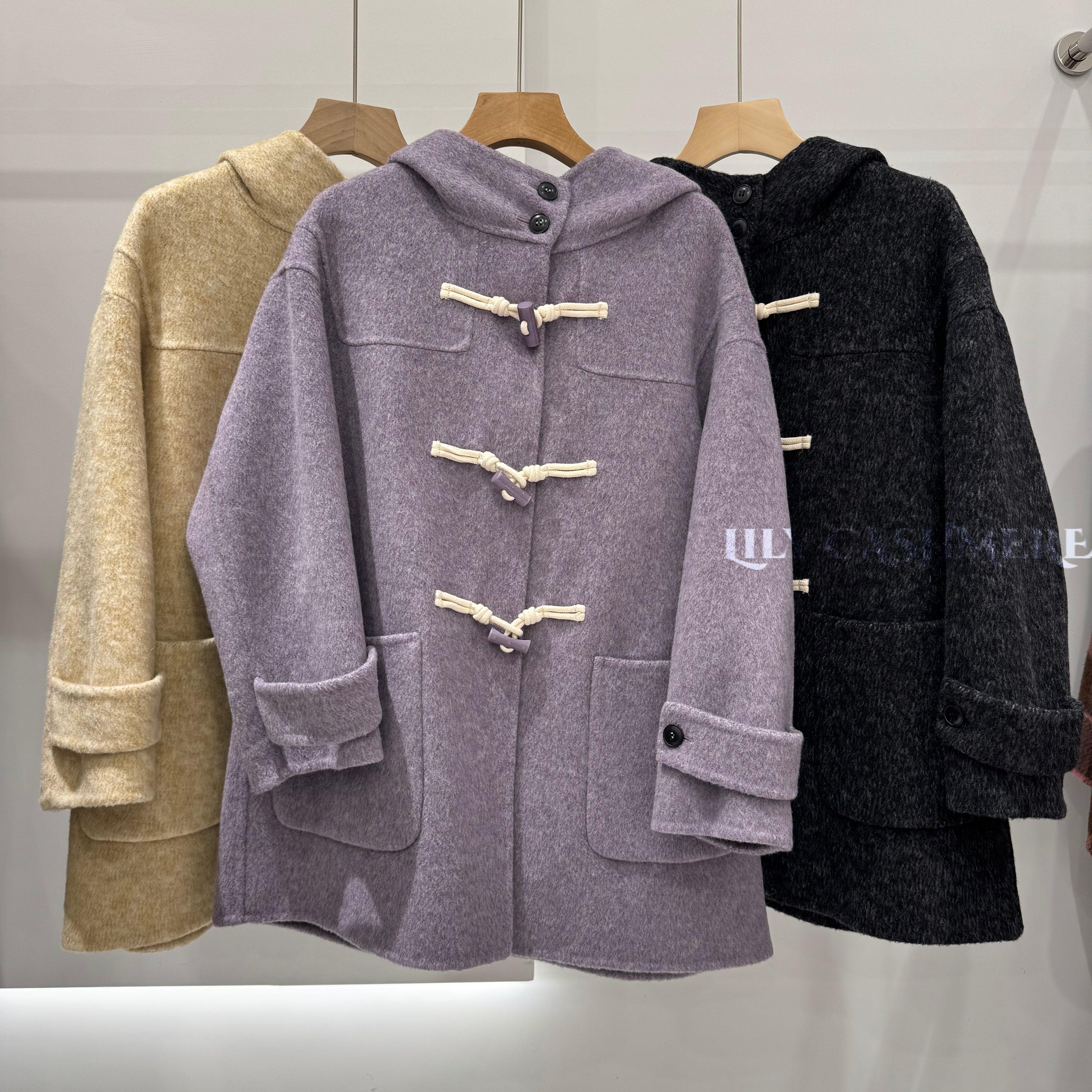 淘宝双面羊毛大衣女简约风中长款连帽牛角扣宽松毛呢外套2025秋冬新款