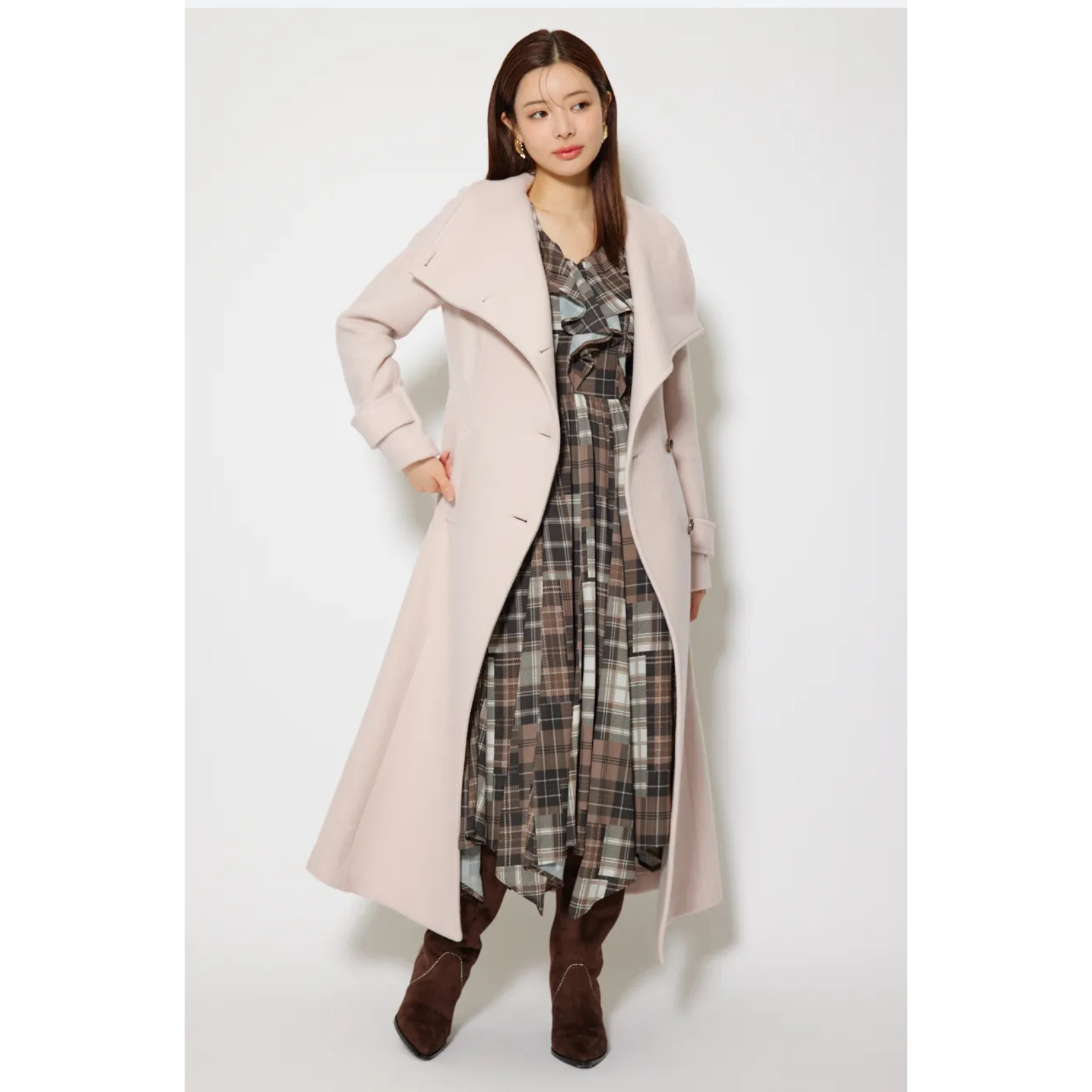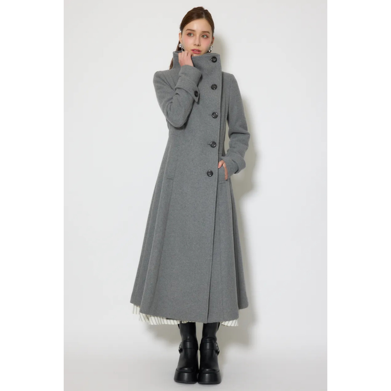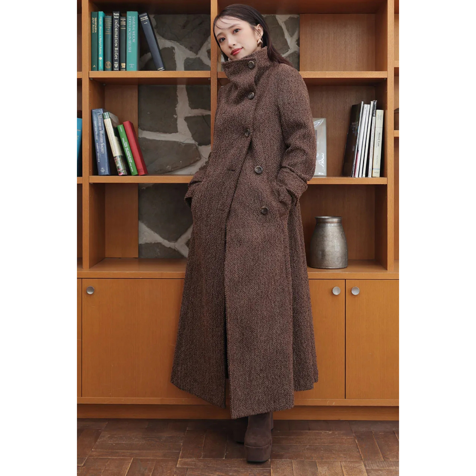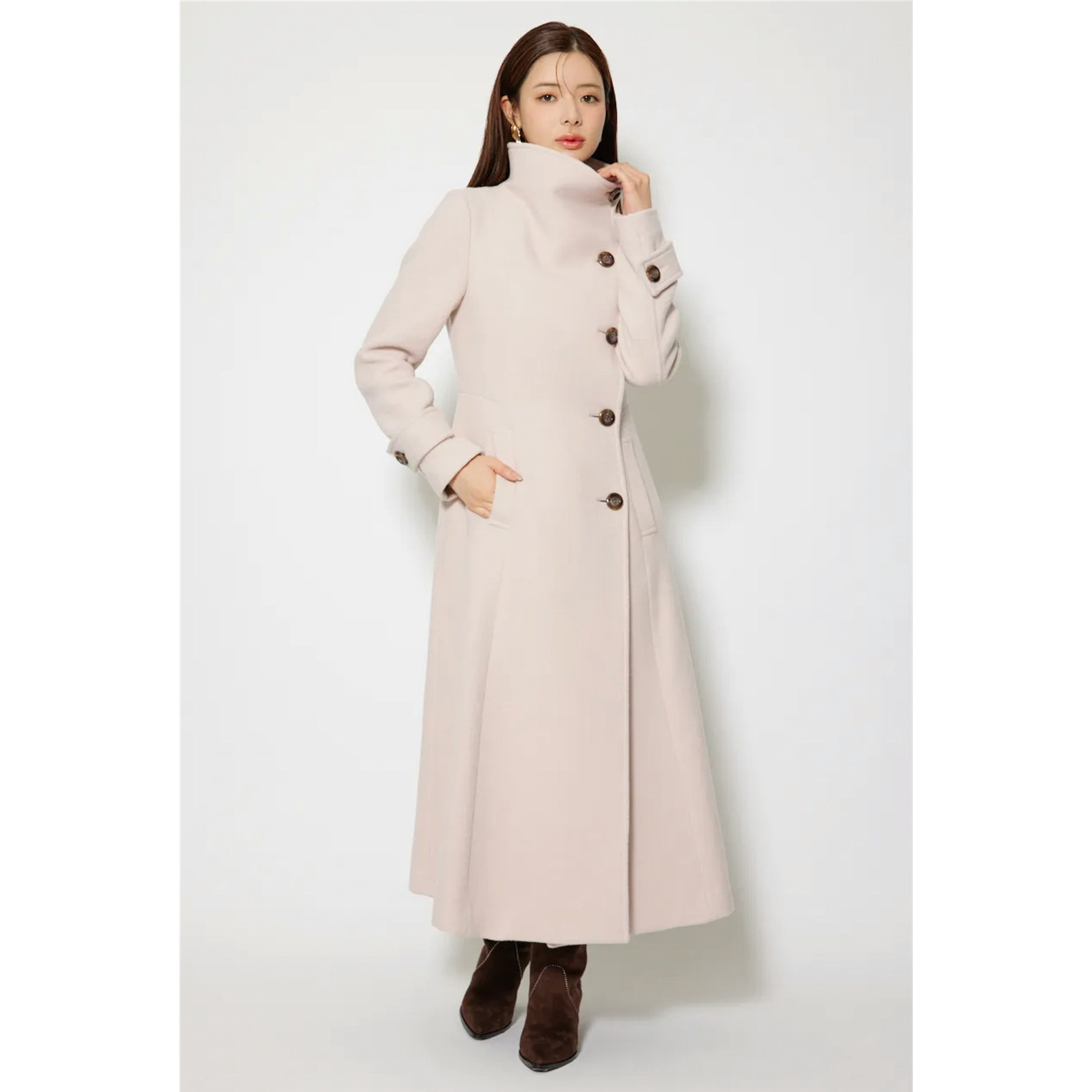 这款日单品牌冬季新款羊毛呢大衣,以经典大翻领设计搭配斜扣门襟,尽显优雅洋气与独特有型。精选高品质羊毛呢面料,保暖挺括,垂感出众,长款剪裁修饰身形,行走间气场十足。细节处匠心独运,斜扣设计打破常规,增添时尚层次感,兼具实用与美观。整体版型简约而不失设计感,轻松驾驭通勤、约会等多种场合。无论是搭配裙装还是裤装,都能展现女性知性干练又不失柔美的气质。31980日元的定价,诠释高性价比与日系精工品质,是冬日衣橱中不可或缺的时尚单品。