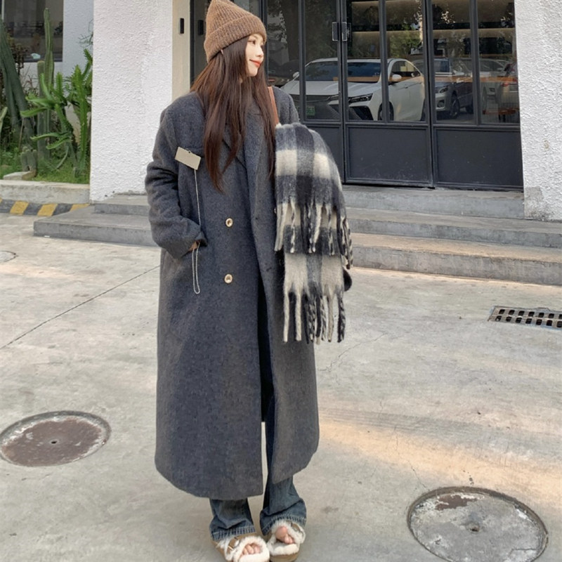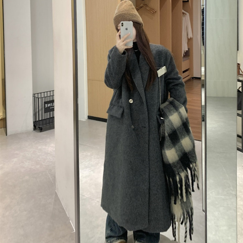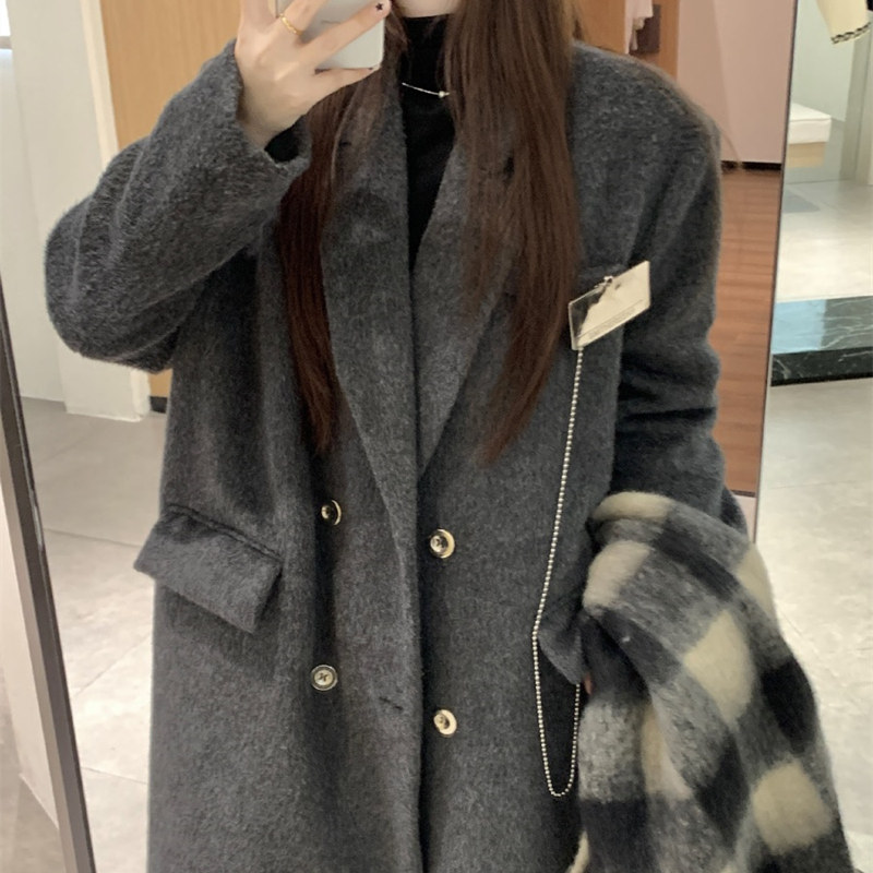 淘宝大码胖mm高级感加厚灰色西装毛呢外套女秋冬季显瘦中长款呢子大衣