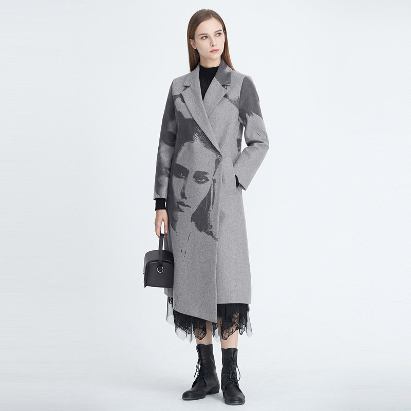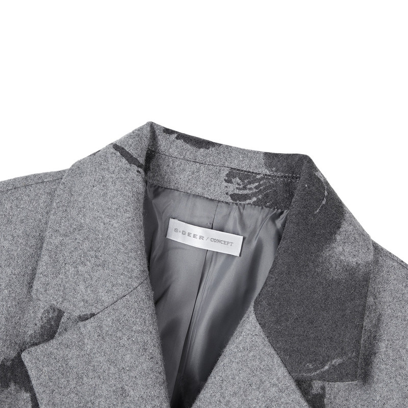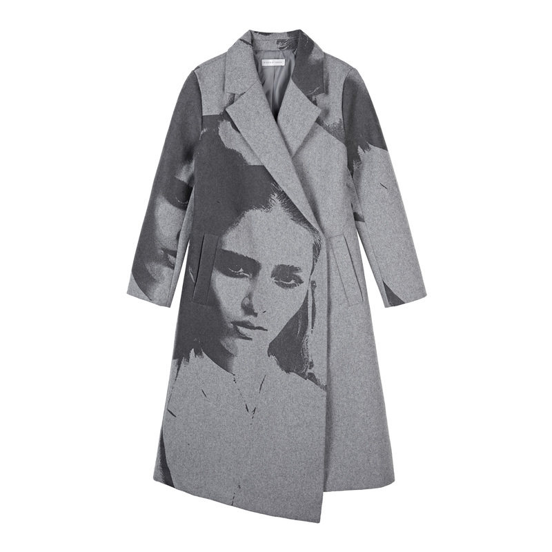 天猫sdeer圣迪奥冬季女装西装领人像印花中长款灰色毛呢大衣S20481818