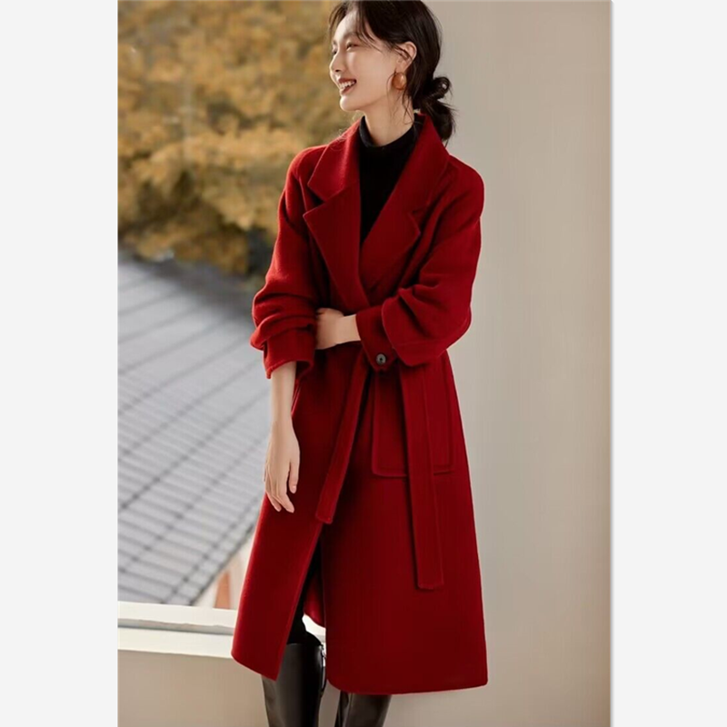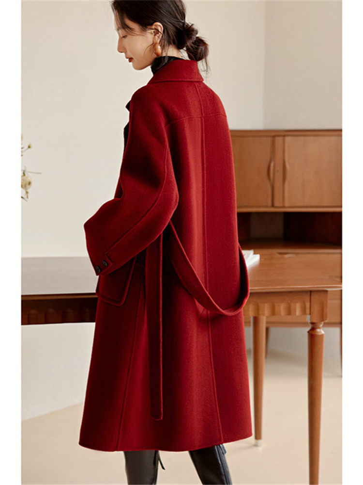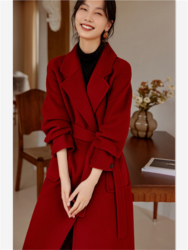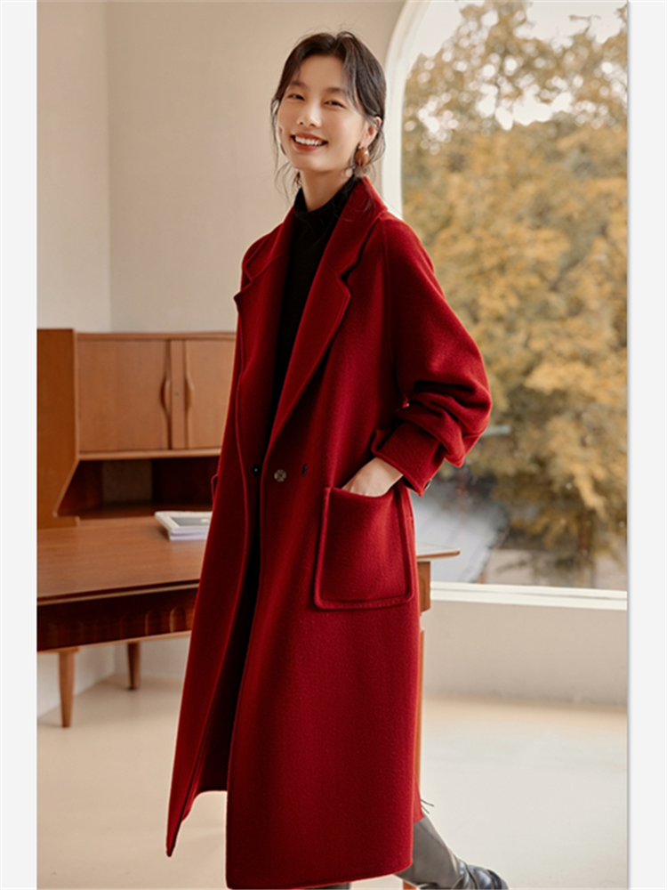 淘宝专柜正品高端简约大气显瘦复古酒红100%全羊毛中长款双面毛呢大衣