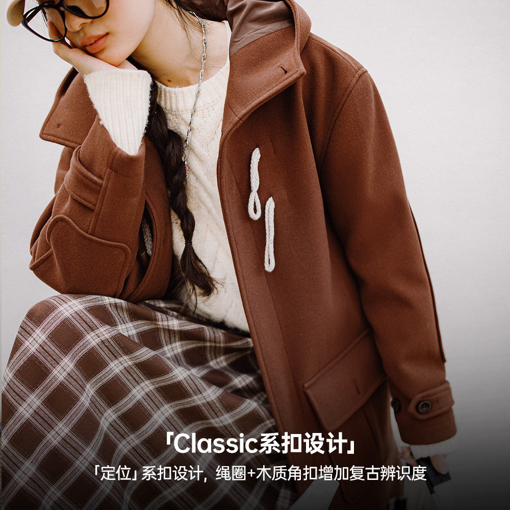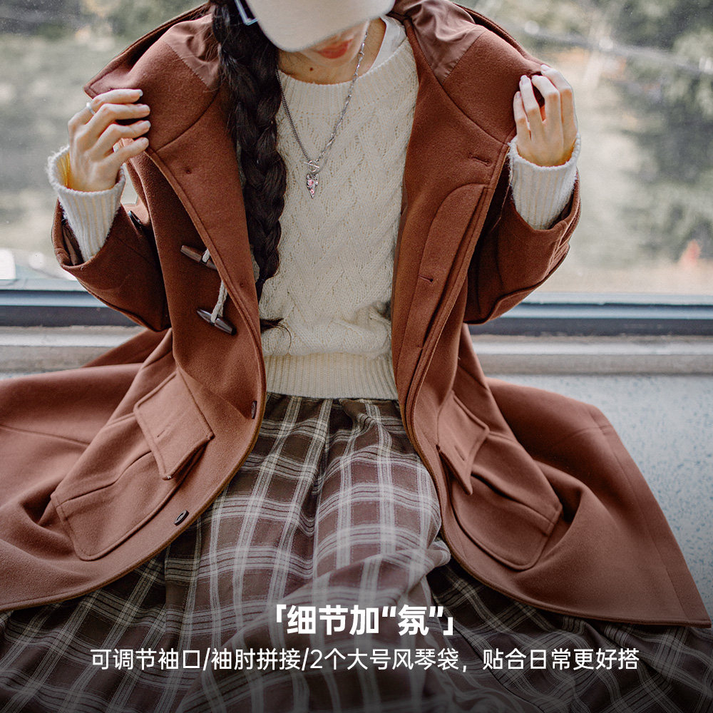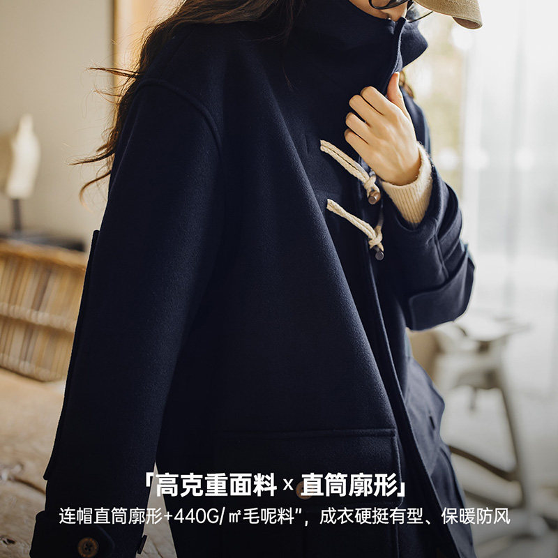 淘宝马登复古学院风牛角扣毛呢鱿鱼大衣中长款宽松连帽厚外套秋季女
