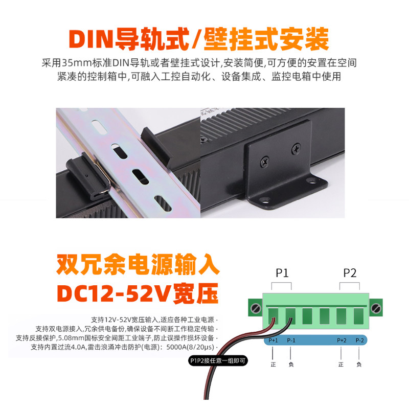 天感闻工业级交换机千兆8口poe交换机监控专用导轨式5口工业网络交换机分线器环网管理型交换机百兆6000V防雷